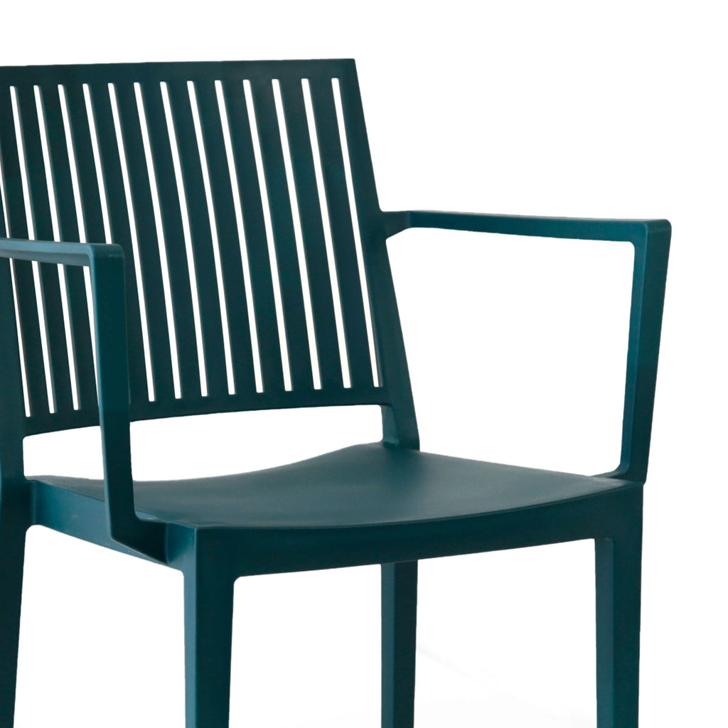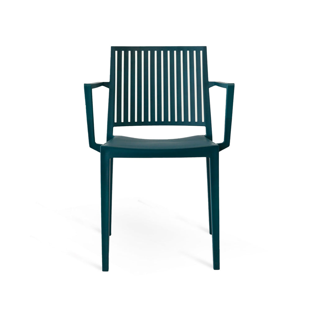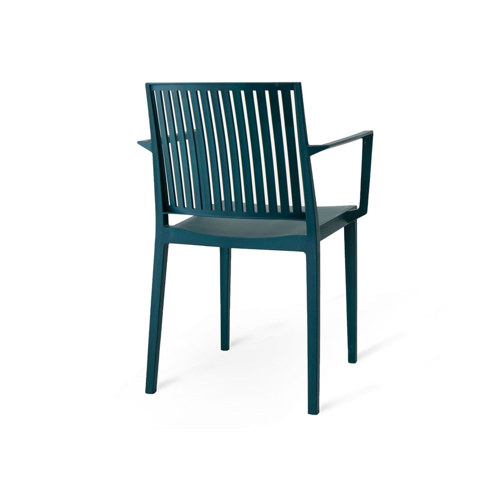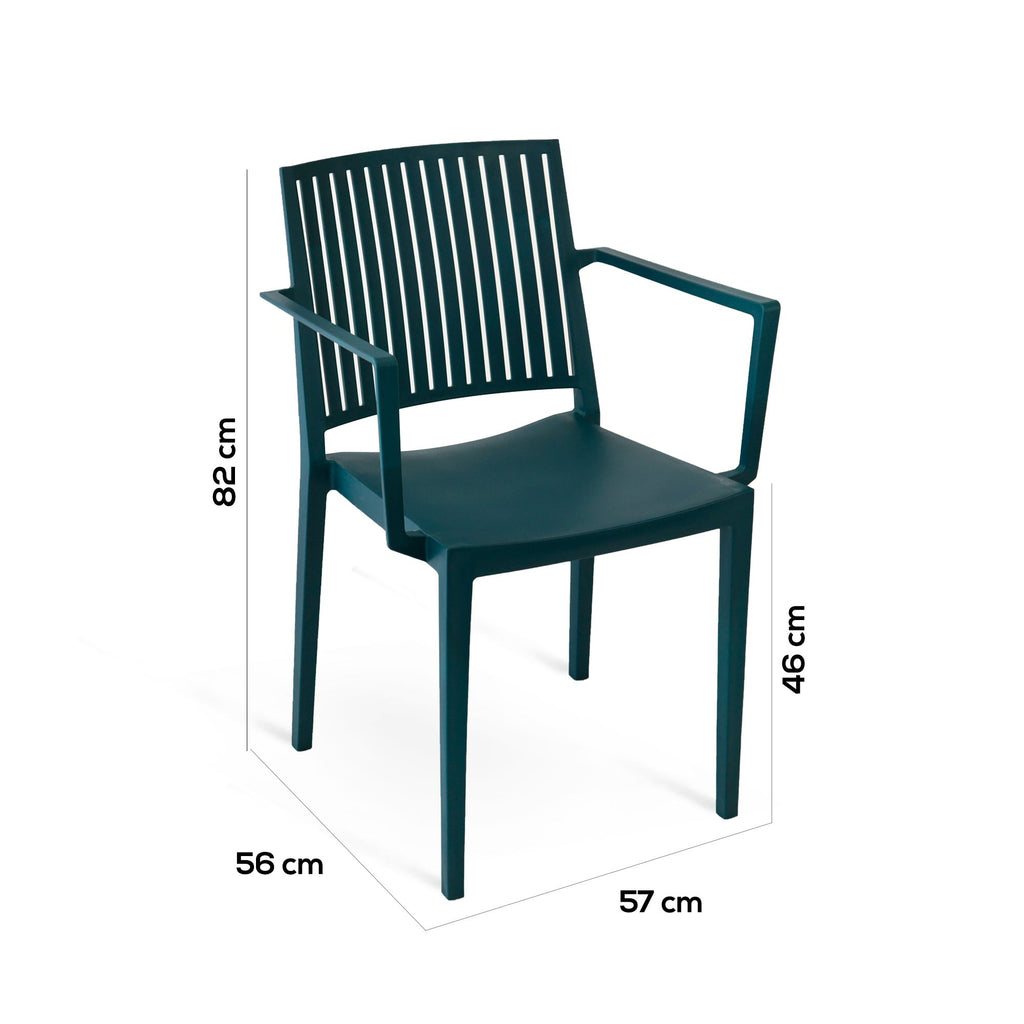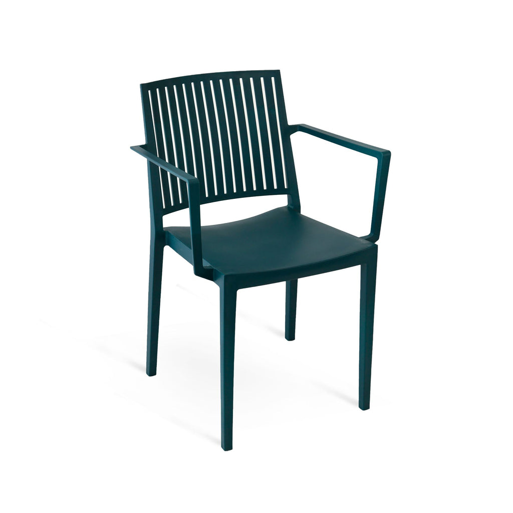 Fauteuil avec accoudoirs entièrement réalisé en polypropylène pétrole. Dimension : 57*56*H82 cm Hauteur d'assise : 46 cm Coloris : Noir Matériaux : Polypropylène Entretien du produit : Nettoyer avec un chiffon humide et de l'eau tiède, enlever les taches uniquement avec des produits spécifiques