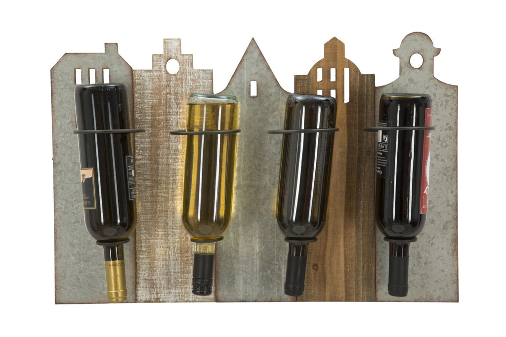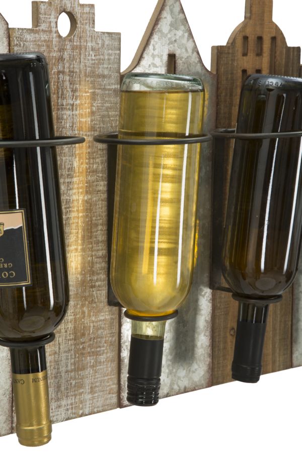 Pratico portabottiglie da muro in mdf e metallo dal design che richiama lo skyline di una metropoli. Aperitivo nel weekend? Sì ma con stile grazie a portabottiglie di grande tendenza.