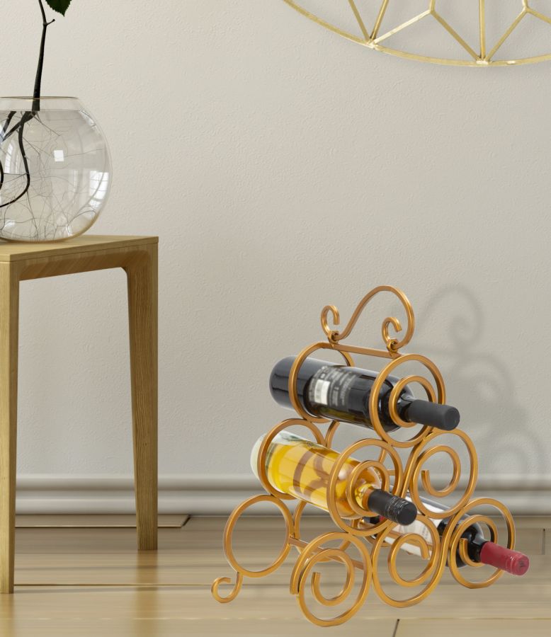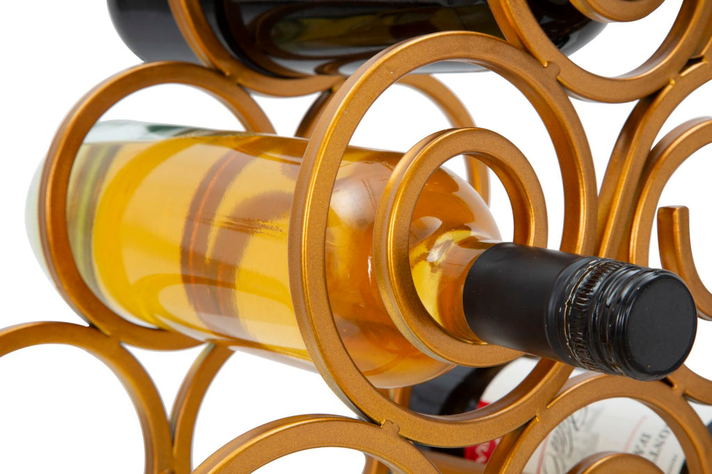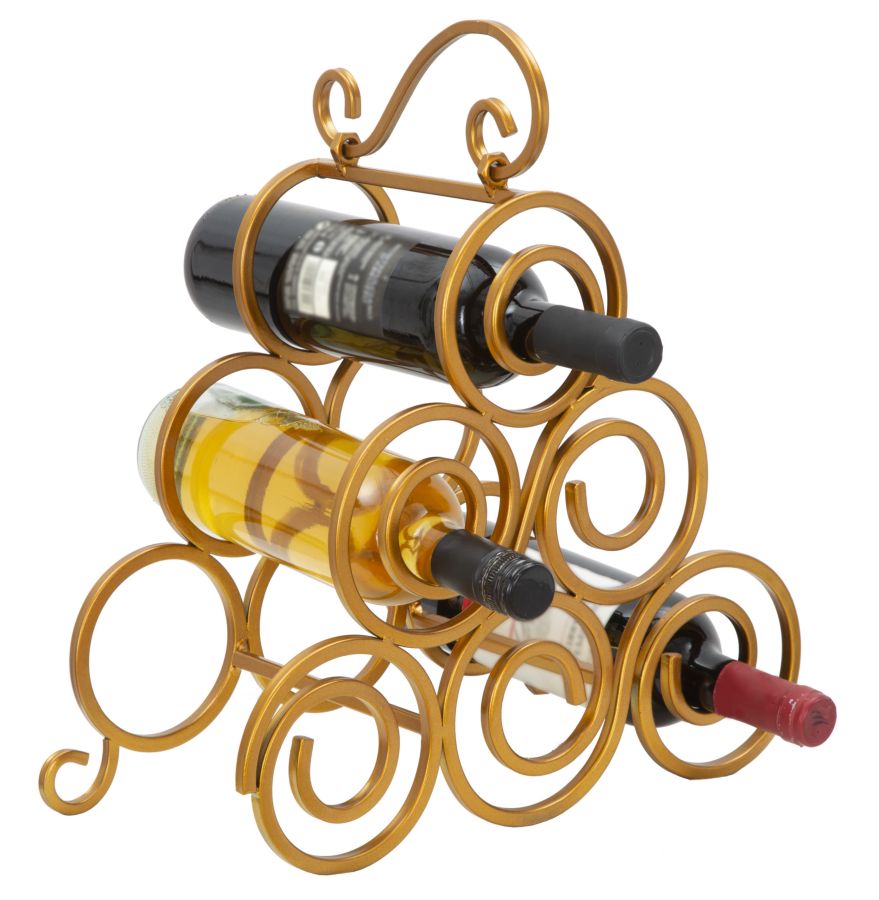 Elégant porte-bouteille de table en métal doré. Pour les amateurs de bon vin, un porte-bouteille glamour qui donne classe et raffinement à votre coin de plaisir. Il peut contenir 6 bouteilles.