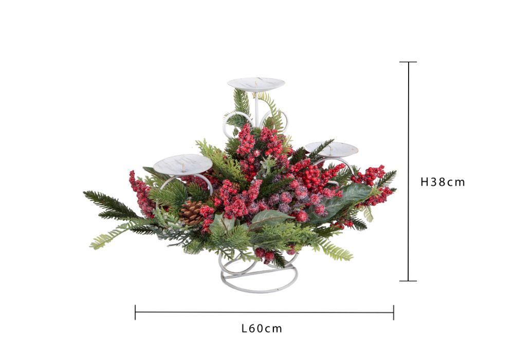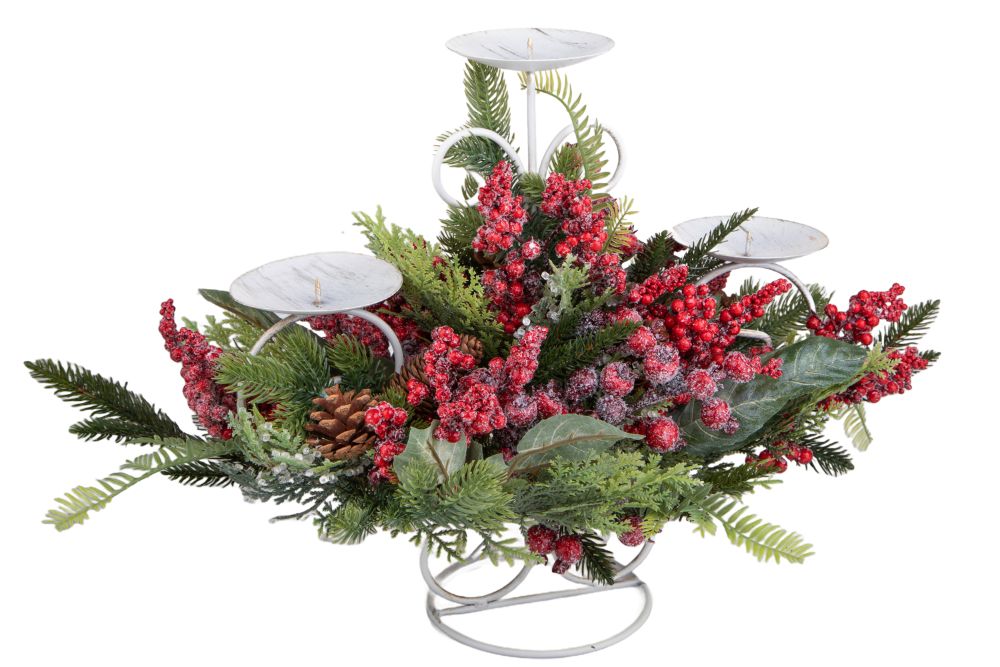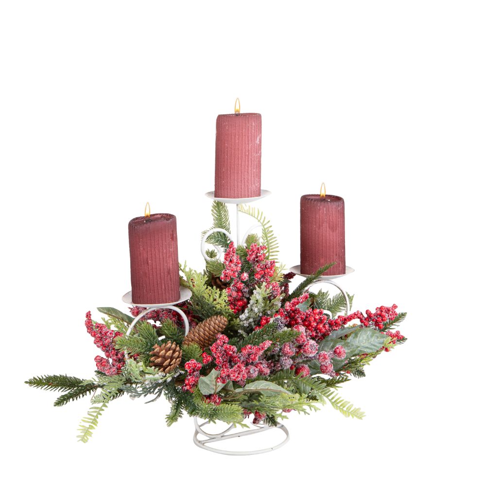 - Portacandela con mix di fiori rossi e pigne per stile unico e rustico.