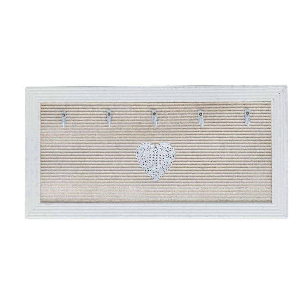 Ce porte-clés mural dispose de 5 crochets pour placer des clés, des cordons, etc. Fabriqué en bois pour garantir une grande qualité et résistance dans le temps. Design moderne et élégant dans le style Shabby avec un ornement central en forme de cœur qui décorera encore plus le porte-clés à l'intérieur de votre appartement. Grâce aux crochets arrière de l'article, le poser au mur sera un jeu d'enfant. Les 5 crochets avant sont résistants et déjà montés avec des vis pour assurer le contrôle du poids des objets qui seront posés.