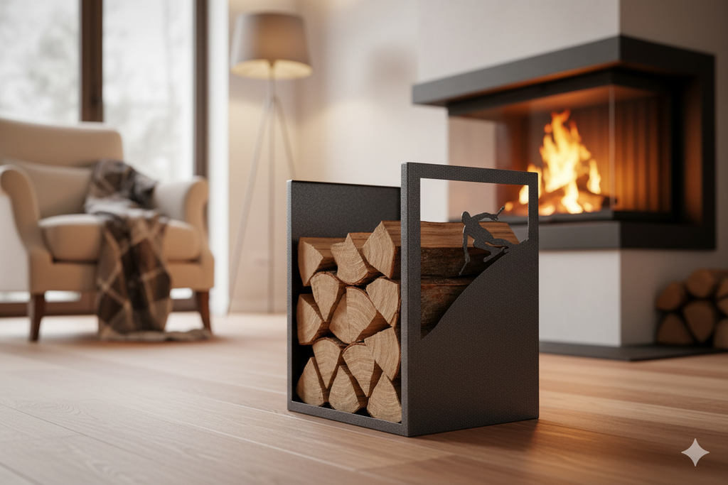 Porta Legna Sagomato Sciatore 40,5x35,5x50 cm in Ferro Verniciato Grigio Martellato - La Ferrotecnica