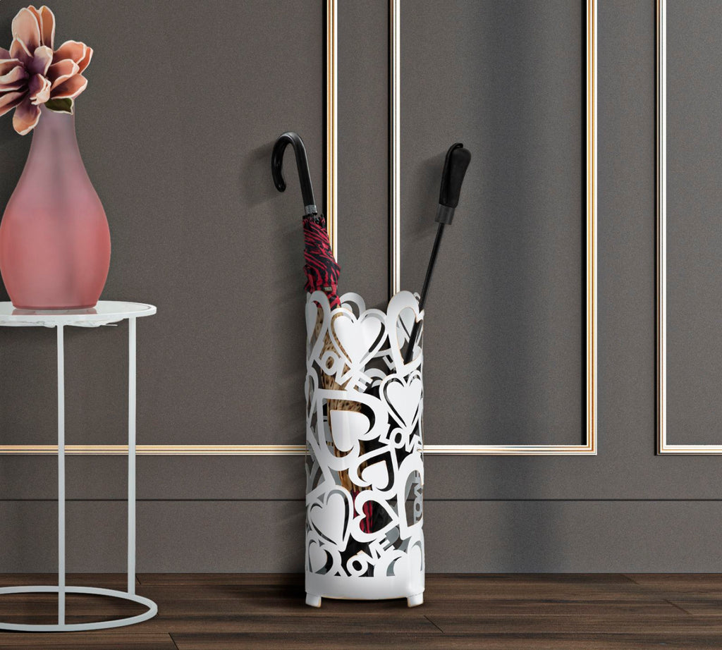 Porte-parapluie rond simple en métal blanc avec des profils dorés et d'élégants cœurs décoratifs qui créent un tissage abstrait mais délicat. Une touche de raffinement à l'entrée de votre maison.