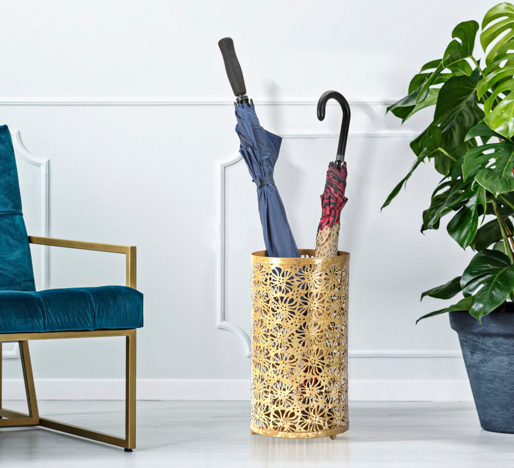 Porte-parapluie rond en métal doré aux délicates décorations florales. Pas seulement utile. Les porte-parapluies dorés donnent une touche de lumière même au coin le plus anonyme.