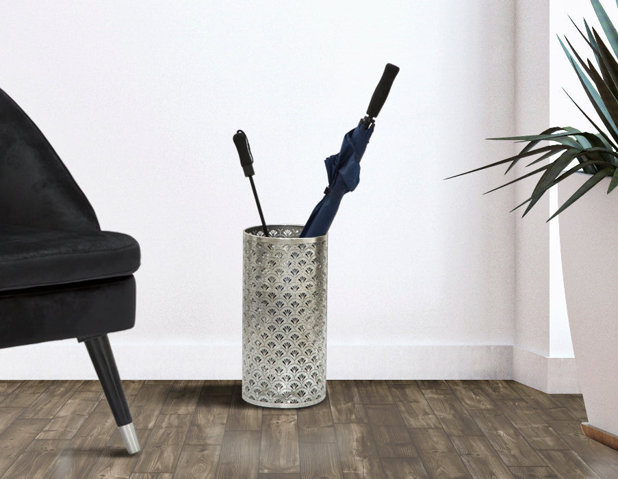 Porte parapluie rond en métal argenté. Les incrustations florales en font un complément pratique qui ne peut manquer dans aucune entrée au style raffiné.