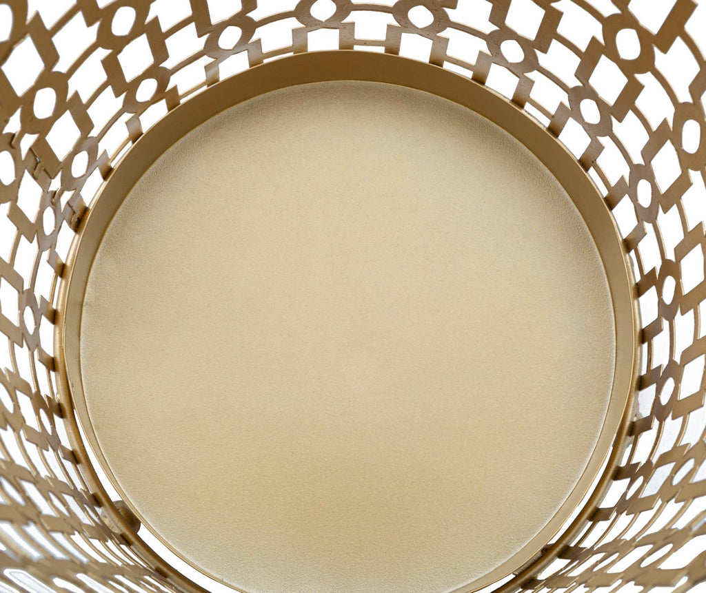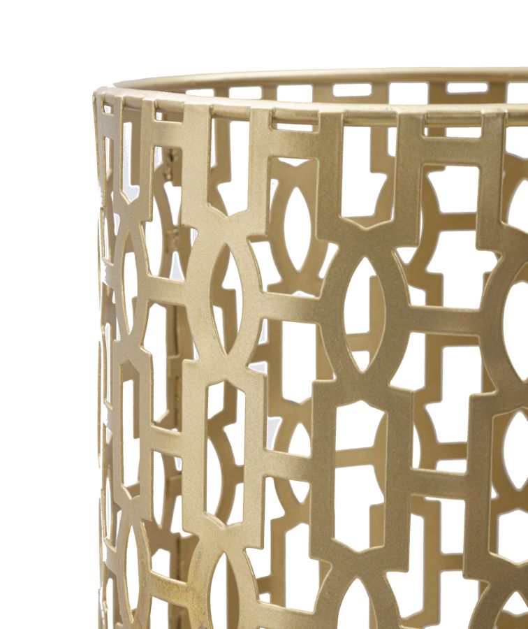 Porte parapluie rond en métal doré. Les sculptures particulières rappellent les précieuses décorations des églises baroques sans alourdir le design. Une touche de classe et de particularité pour rendre votre salon spécial.