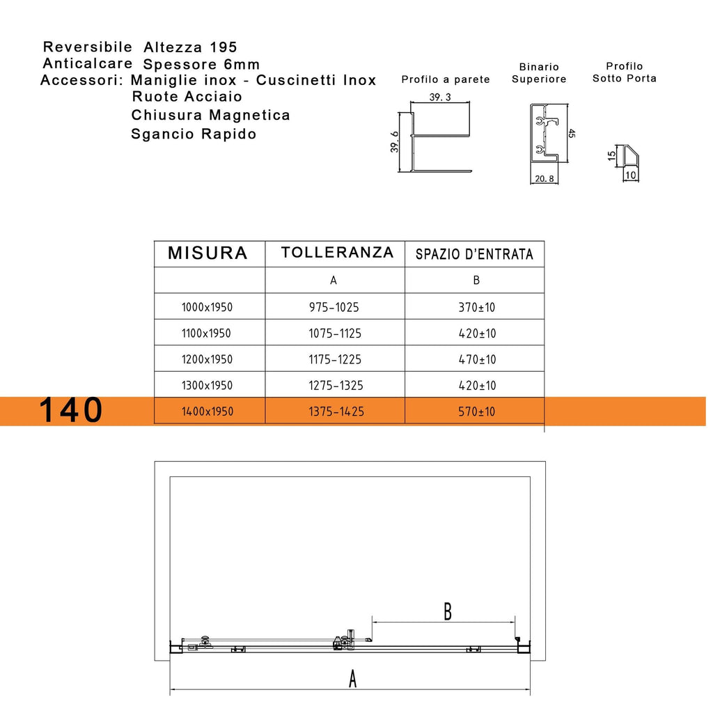 Porte de douche coulissante en niche en verre transparent, porte équipée d' une fermeture magnétique pour une parfaite étanchéité à l'eau, cristal de 6 mm avec traitement anti-calcaire qui empêche la formation de calcaire et facilite le nettoyage en permettant l' élimination des impuretés uniquement avec de l'eau chaude. Il vous permet de faire des économies en n'ayant plus à acheter des produits spécifiques. Peut être installé au ras du sol ou sur un receveur de douche . Roues en acier inoxydable et téflon.