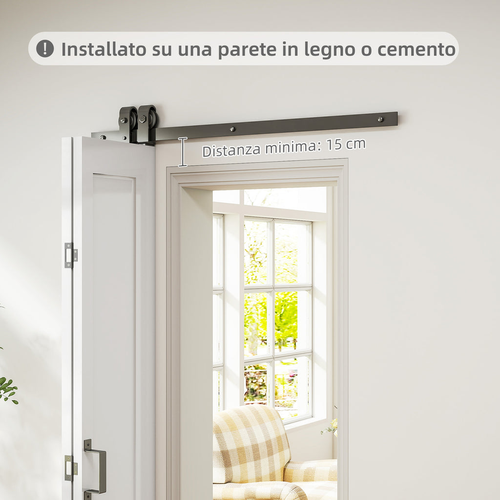 - La confezione include: una porta, un binario, 2 rulli, 2 anti-salto, 2 fermi porta, una guida a pavimento, una maniglia, una chiave a brugola e tutti gli accessori necessari