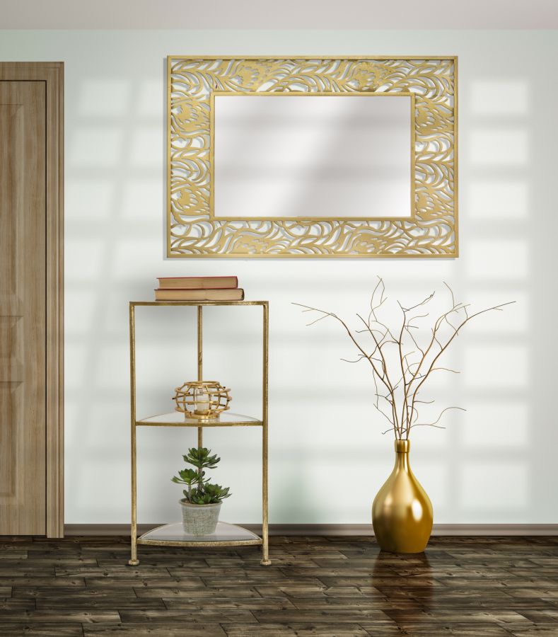 Meuble téléphonique en métal doré avec 3 étagères en miroir. La forme triangulaire particulière aux côtés arrondis crée un effet enveloppant et élégant.