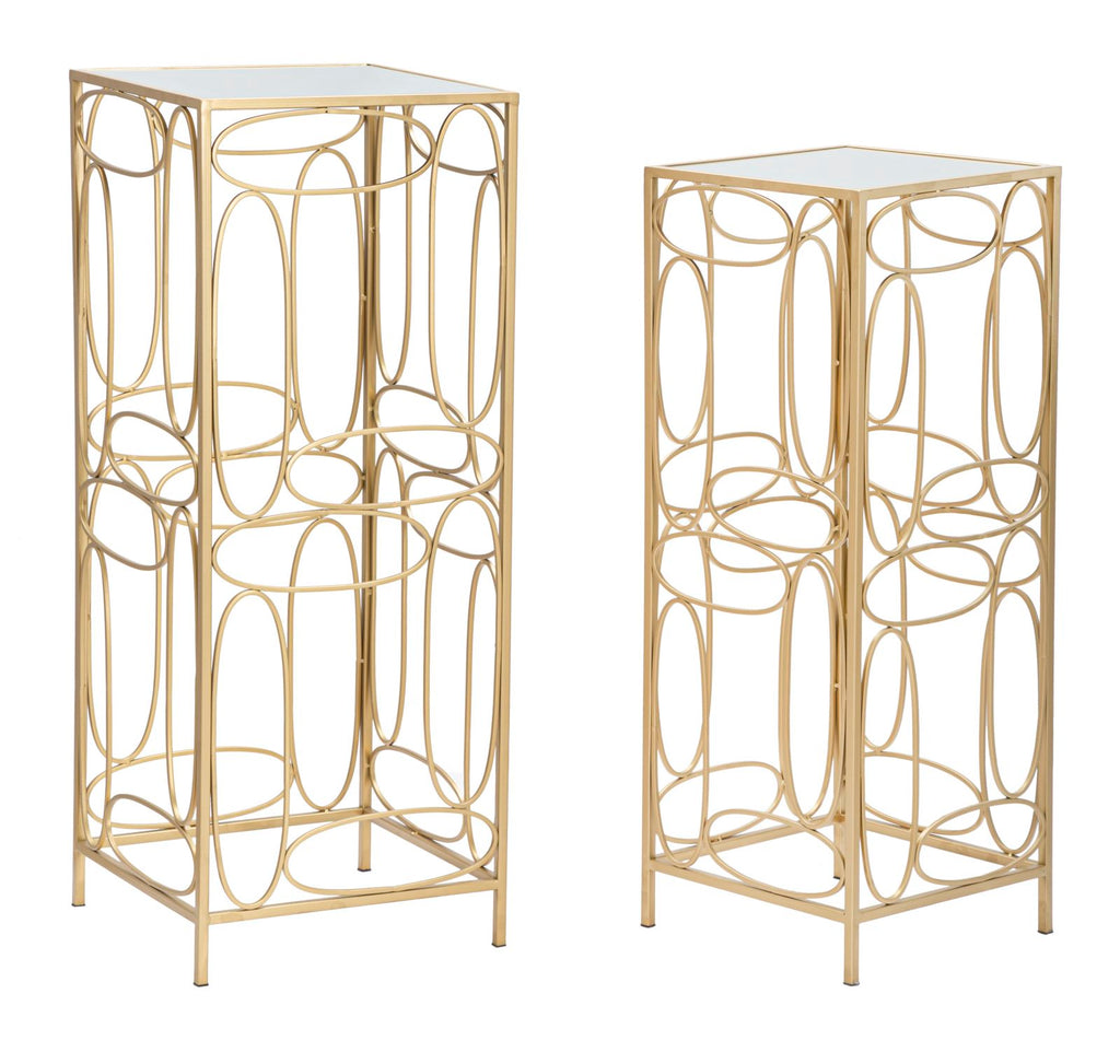 Elégante paire de tables basses carrées en métal doré avec plateau en verre miroir aux lignes géométriques et arrondies. L'élégance et le design s'unissent dans des lignes uniques pour rendre chaque environnement spécial.