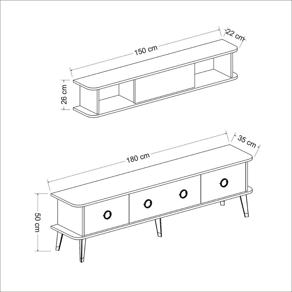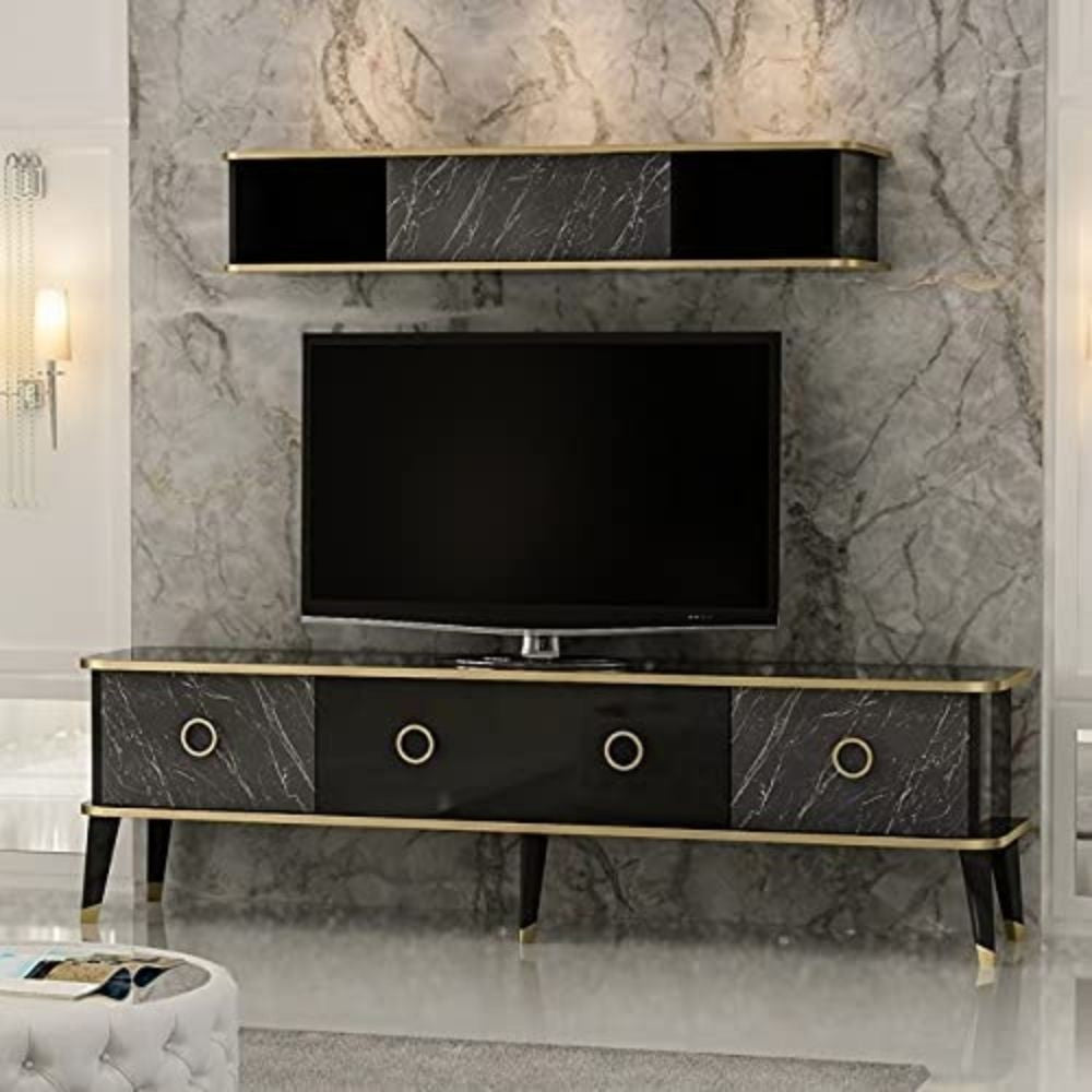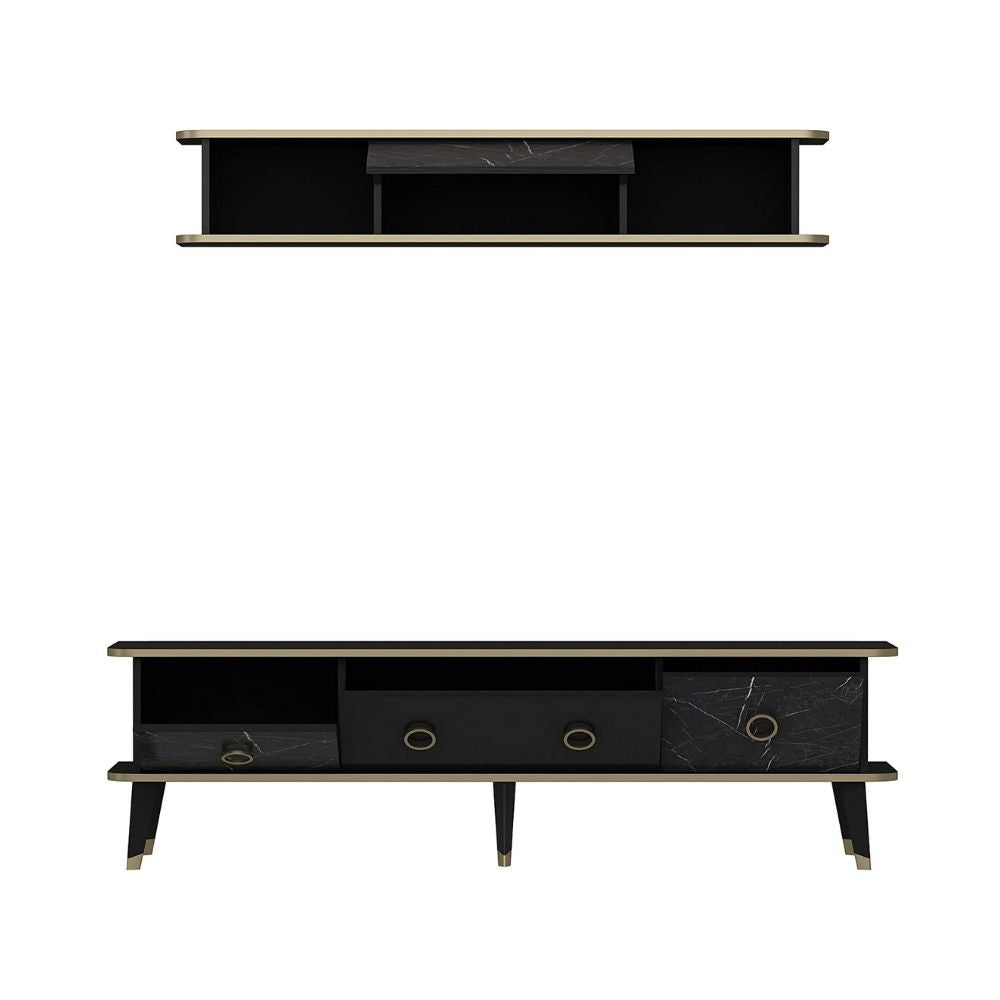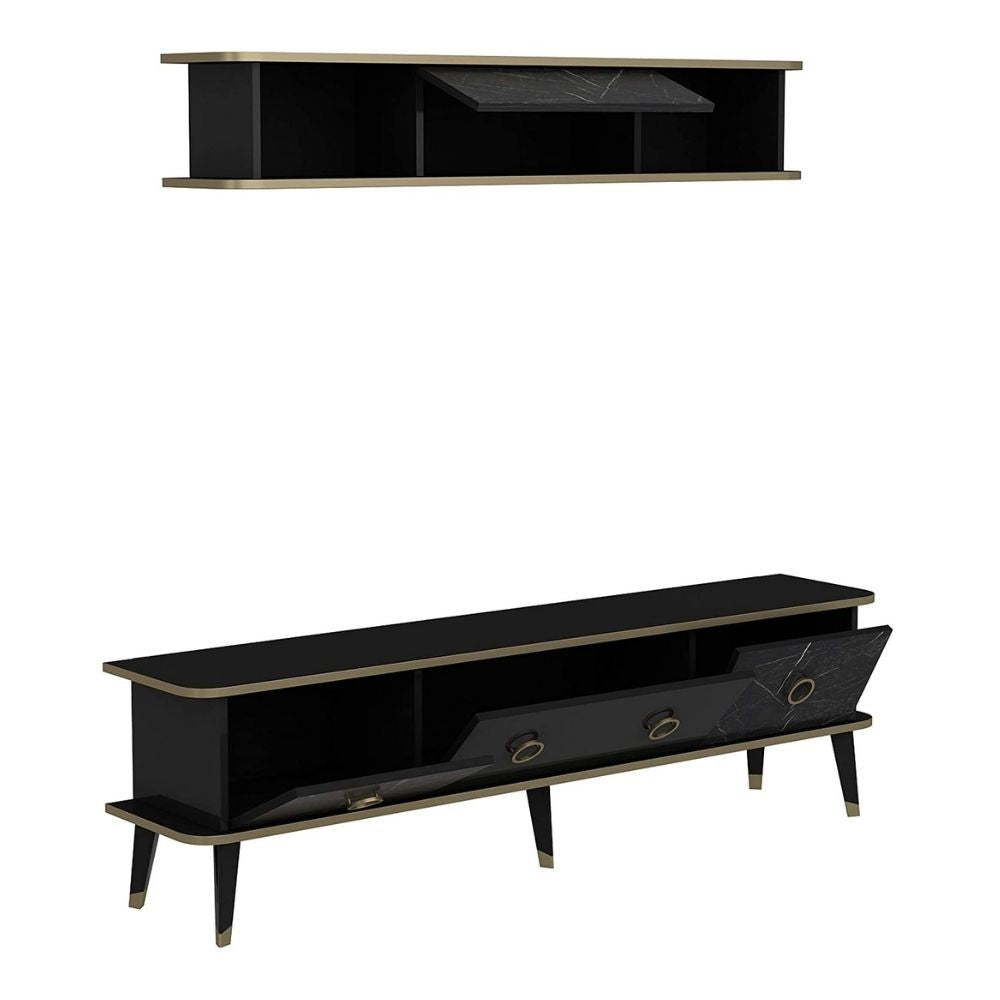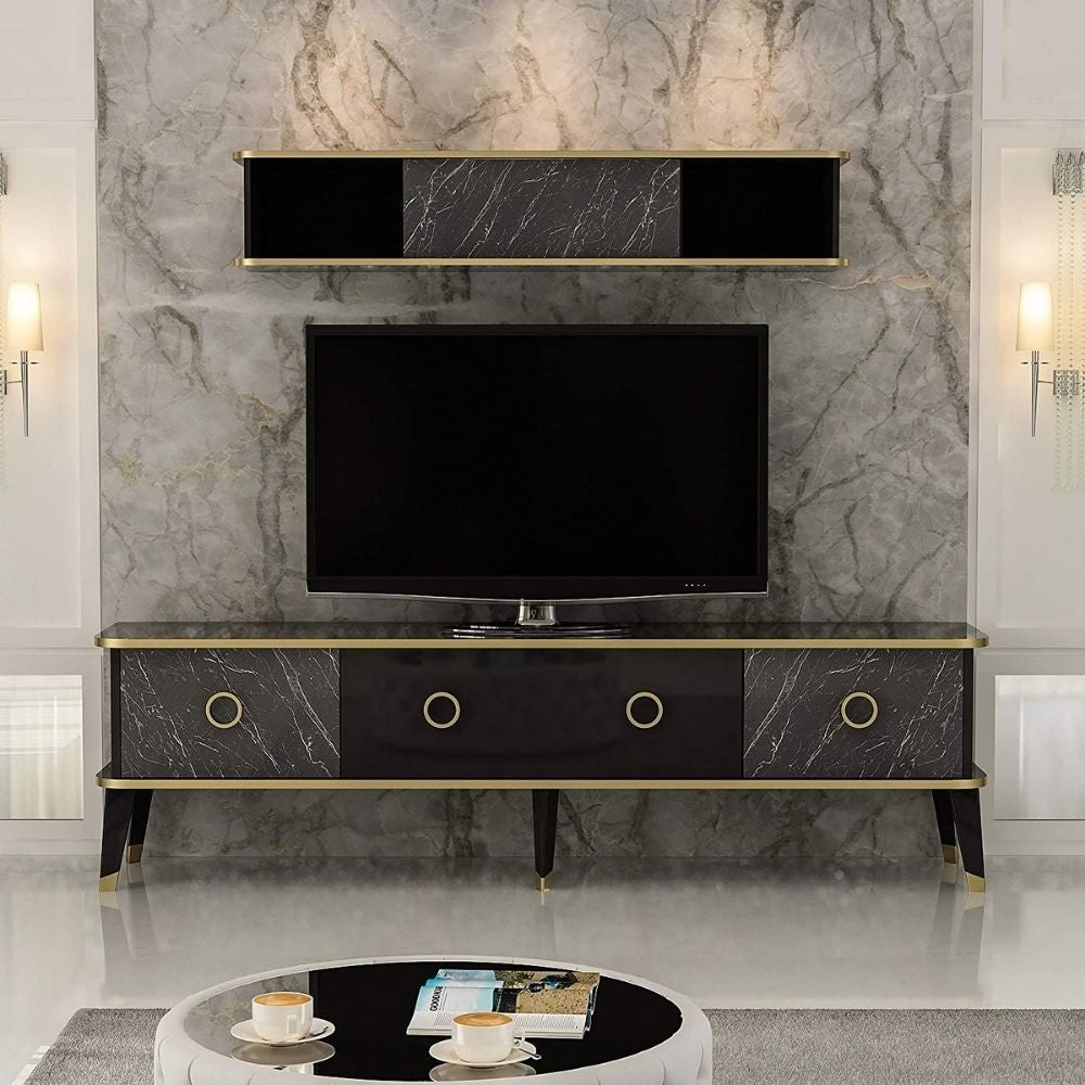 Meuble TV avec élément mural Bientv 180 effet marbre noir avec détails dorés