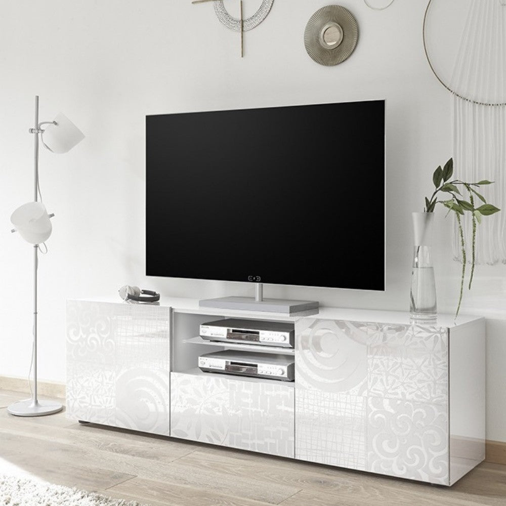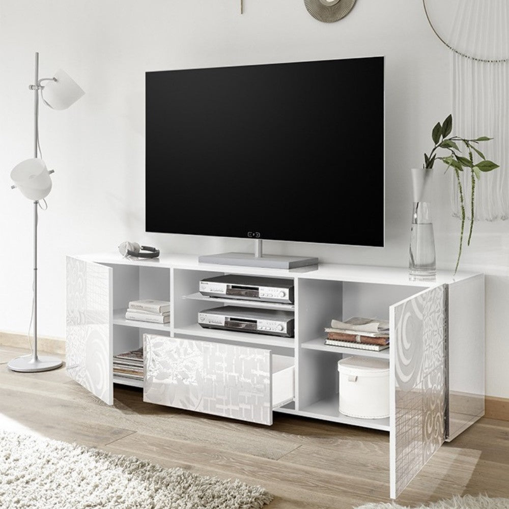 Meuble TV blanc Jasna avec deux portes et un tiroir.