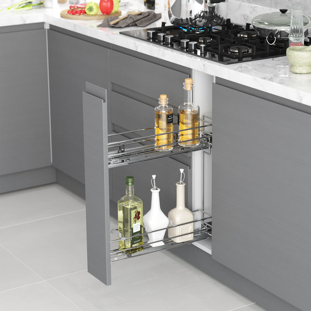 Porte-bouteilles amovible pour bases de cuisine en acier chromé , idéal pour les petits espaces ou les unités auxiliaires. Facile à installer : il se fixe sur le côté gauche du meuble avec réglage total de la porte. La structure est en acier chromé à 2 niveaux et intègre des guides à rouleaux avec extraction totale et fermeture en douceur, qui permettent au système de coulisser en douceur, en évitant les chocs. Le panier inférieur dispose de 4 compartiments pour organiser les bouteilles. Capacité de charge jusqu'à 30 kg.