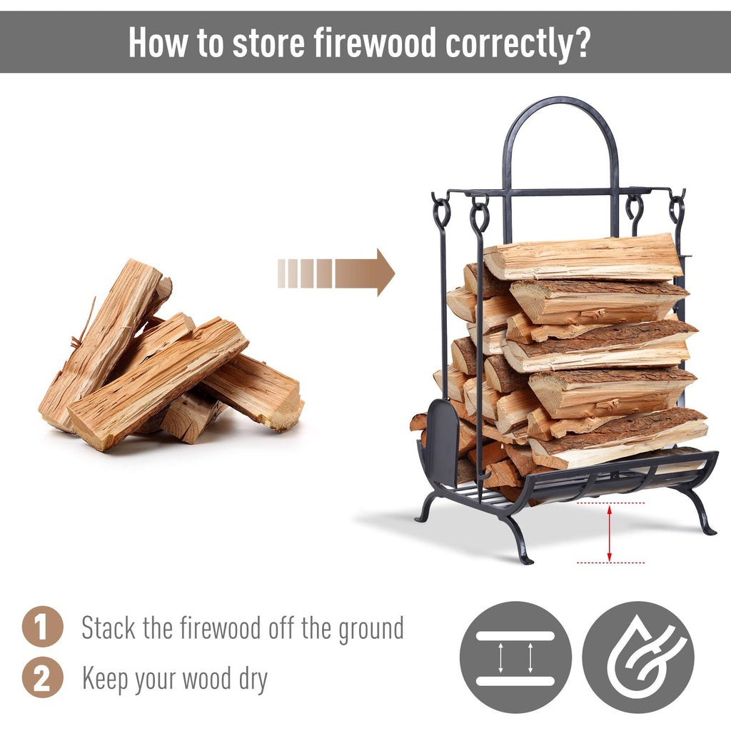 Vous n'aurez plus à vous soucier du bois pour l'hiver prochain : ce porte-bûches peut contenir et retenir jusqu'à 100 kg de bois, idéal pour garder toujours votre cheminée allumée, que ce soit à l'intérieur comme à l'extérieur. Fabriqué en fer robuste, avec une base solide et durable, surélevé du sol pour éviter l'humidité et garder le bois sec. Les crochets offrent l'espace idéal pour suspendre des accessoires, soit quatre outils au total : brosse de toilette, spatule, pince et tisonnier.