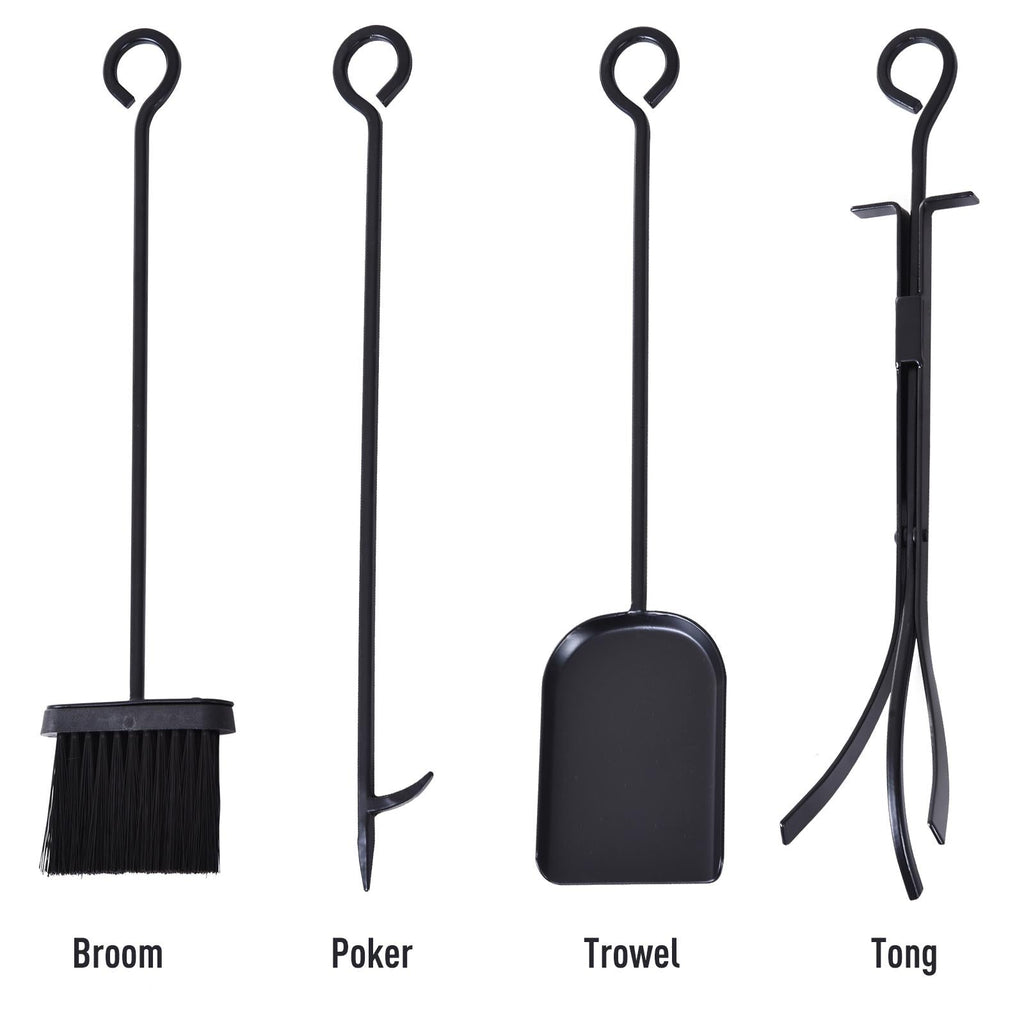 - L'ensemble comprend 4 outils : 1 spatule, 1 balai, 1 tisonnier et 1 pince