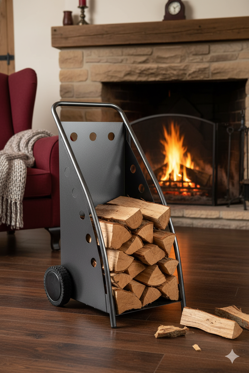 Portalegna in ferro sp. mm 1.5, verniciato colore grigio martellato, con ruota in PVC e copriruota, Made in Italy, facile da pulire con un panno umido, montaggio non richiesto.