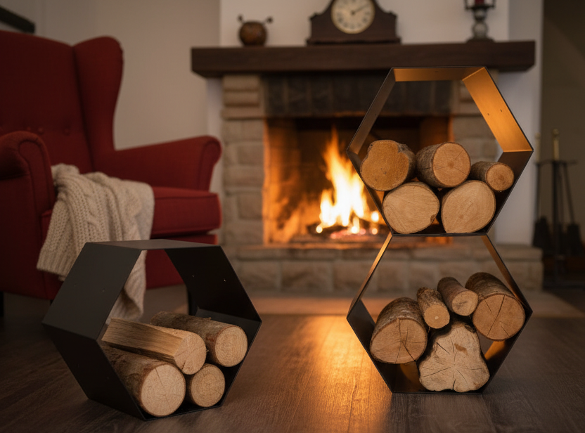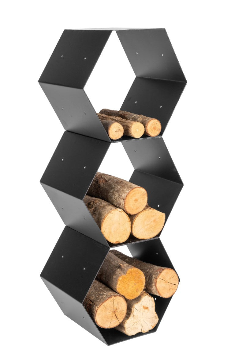 Portalegna esagonale in ferro sp. mm 1.5, verniciato colore nero opaco, componibile (viti incluse), Made in Italy, facile da pulire con un panno umido, montaggio richiesto solo per acquisti superiori a pz 1.