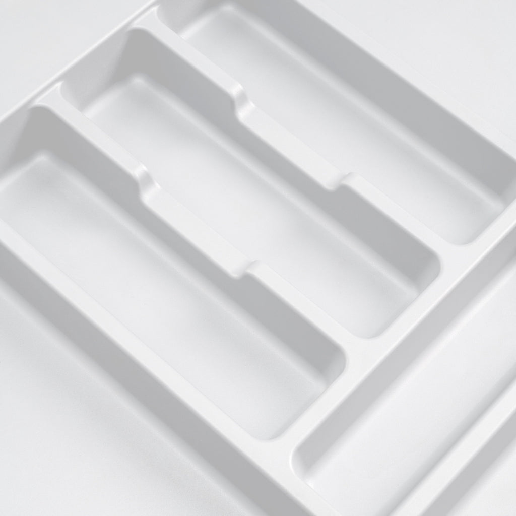 Porte-couverts pour tiroirs de cuisine Vertex et Concept au design linéaire et avec une grande capacité de remplissage pour couverts et autres ustensiles de cuisine. À utiliser avec des tiroirs montés en modules d'une largeur de 400 mm à 1000 mm, d'une profondeur de 500 mm et avec des panneaux de 16 mm d'épaisseur. Fabriqué en plastique blanc et gris anthracite.
