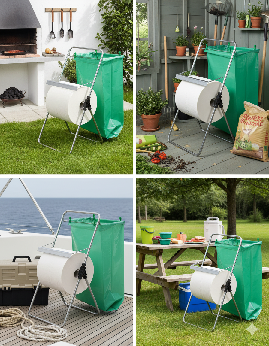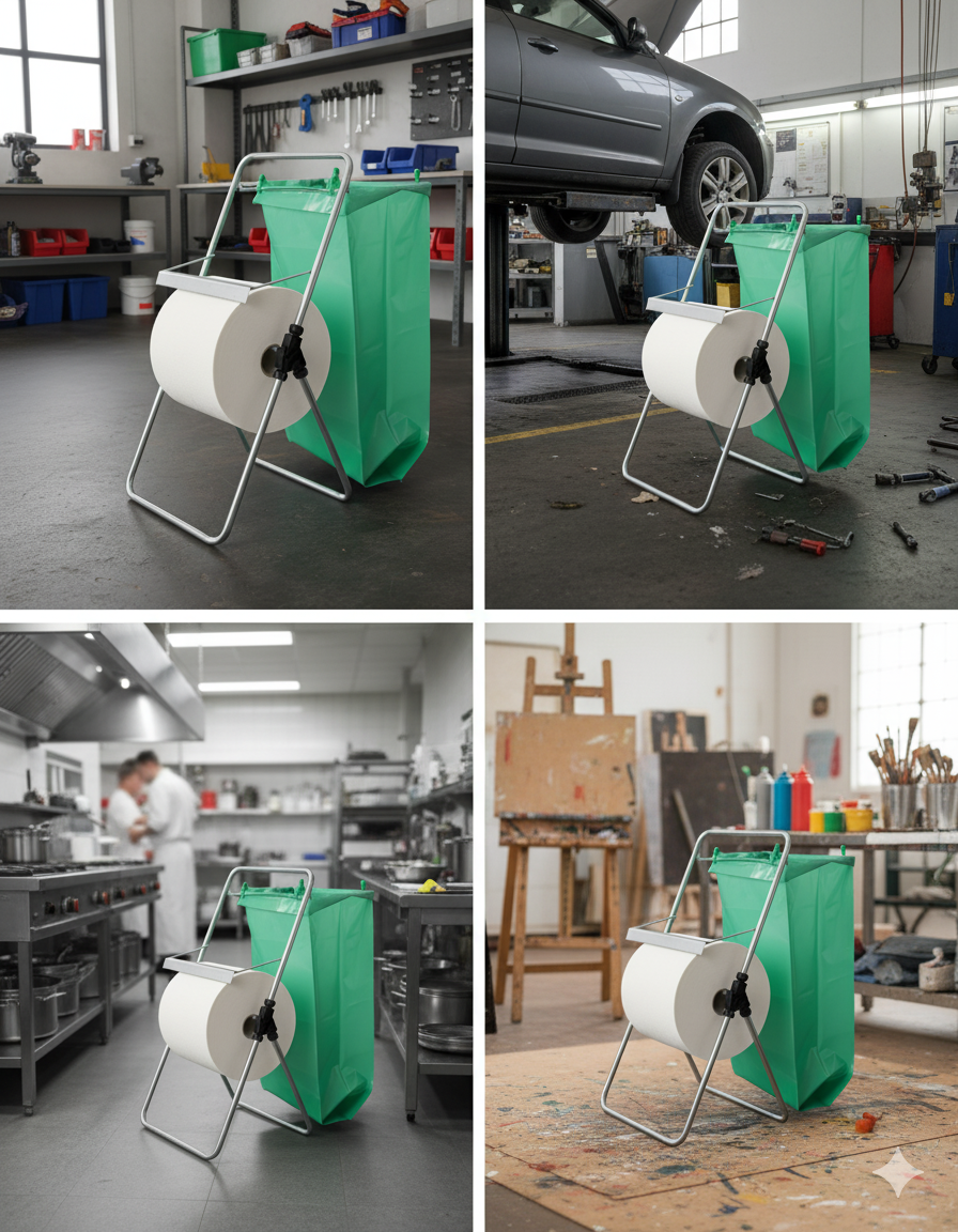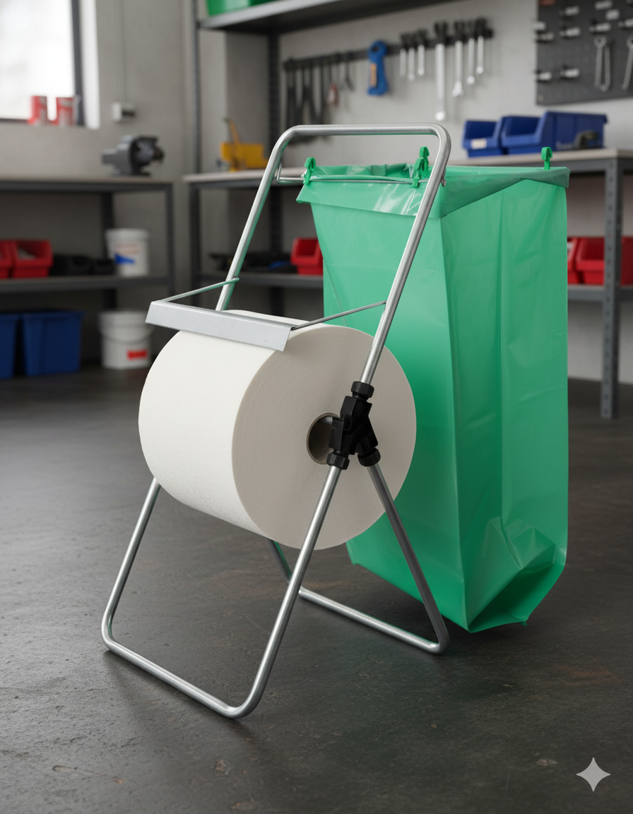 Caractéristiques techniques Chevalet porte-rouleau en acier avec porte-sac argenté