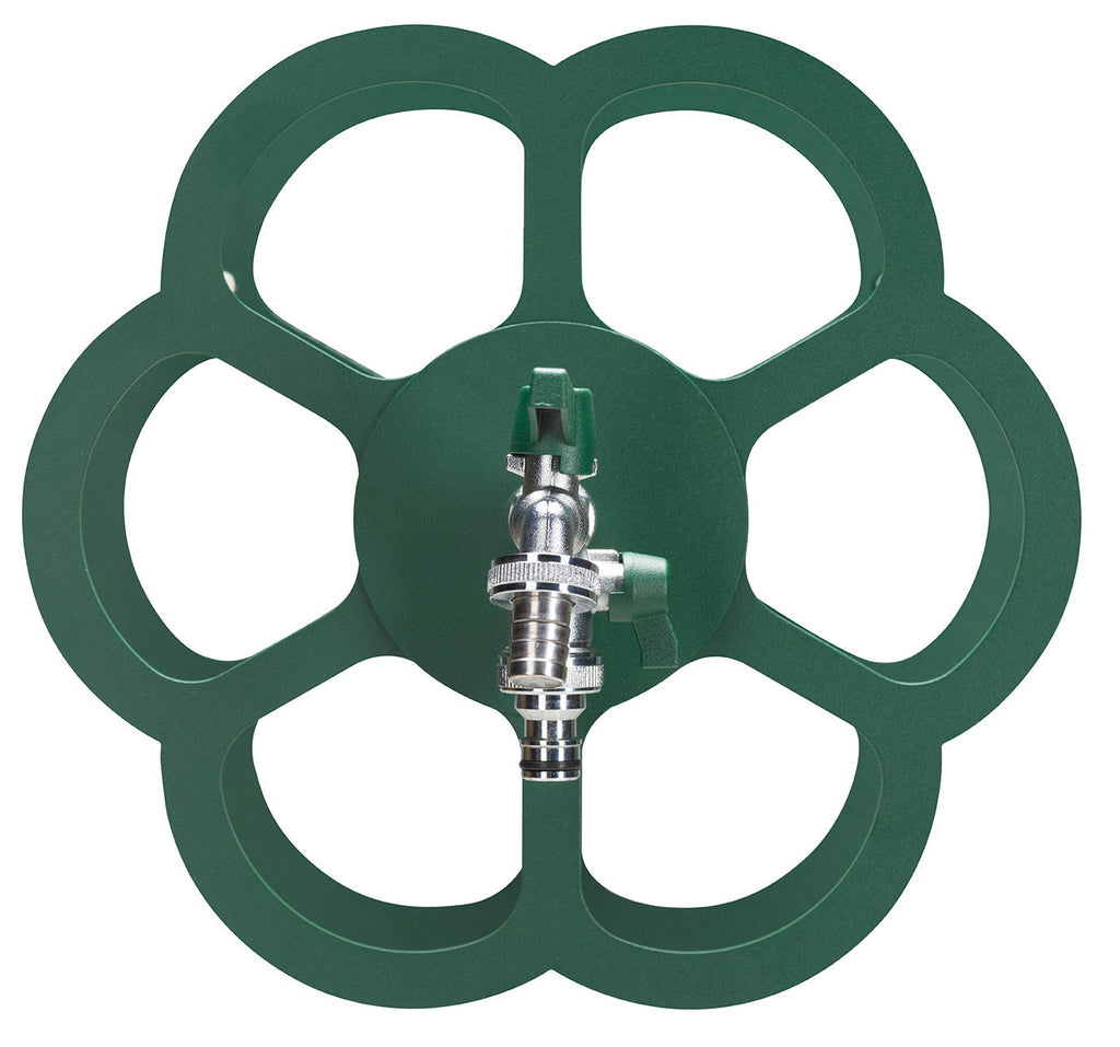 Support de tuyau mural pratique qui permet de transformer un simple robinet en un élément fonctionnel et décoratif où vous pourrez ranger soigneusement le tuyau d'arrosage, en le gardant toujours connecté au robinet secondaire.
