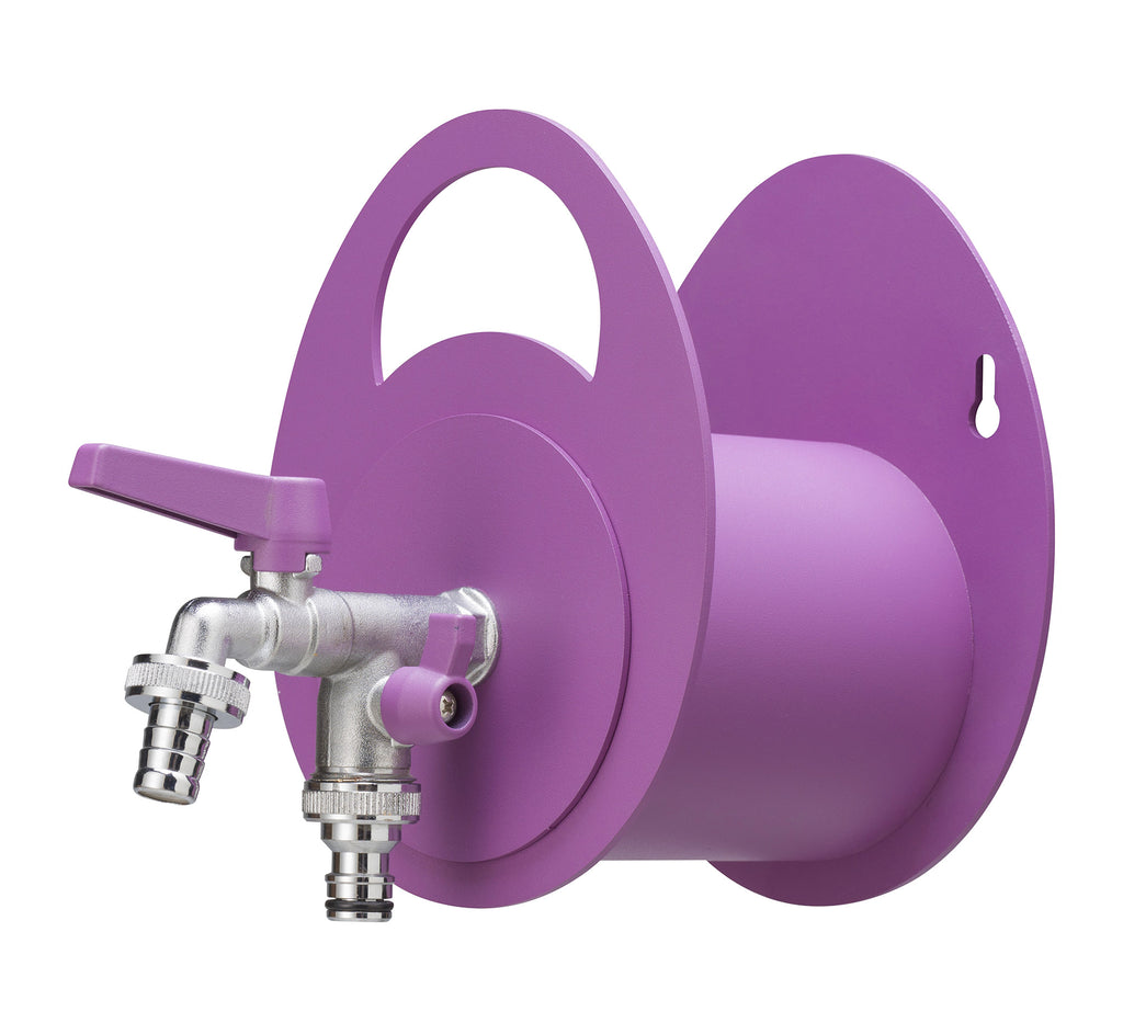 Pratico portatubo a muro che permette di trasformare un semplice rubinetto in un elemento funzionale e decorativodove riporre ordinatamente il tubo da innaffio, tenendolo sempre collegato al rubinetto secondario.