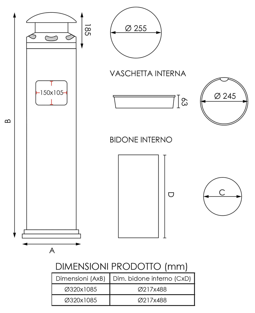 Cendrier colonne avec panier en acier équipé d'un trou central pour jeter les déchets. La poubelle interne amovible facilite le vidage des déchets et est équipée d'une poignée.
