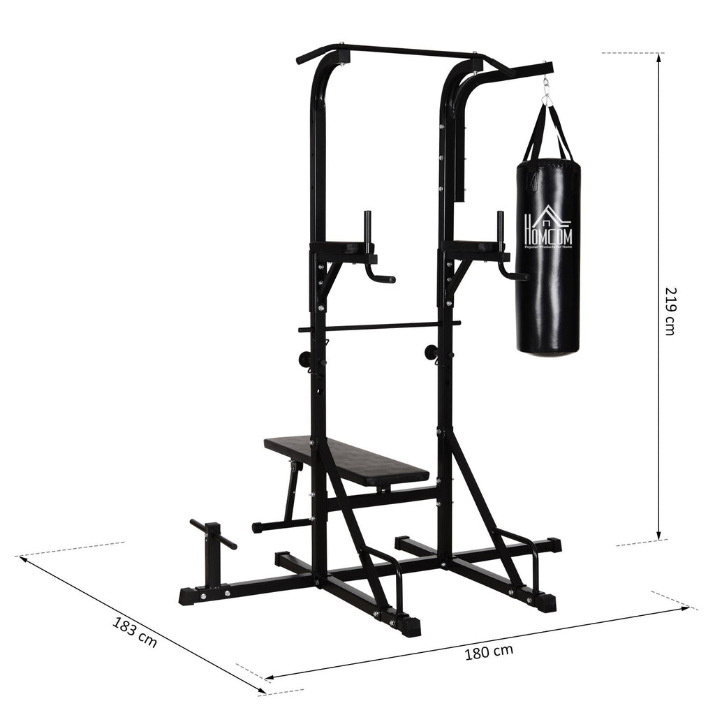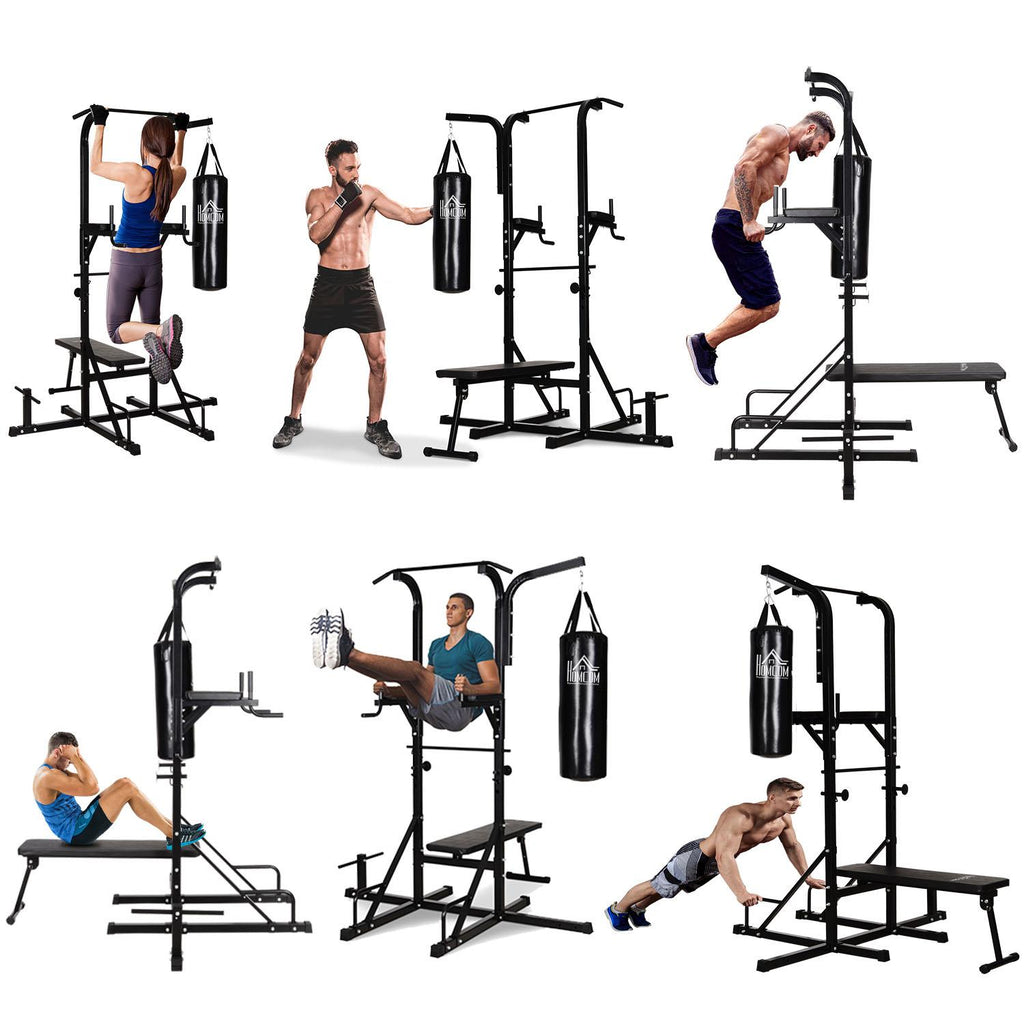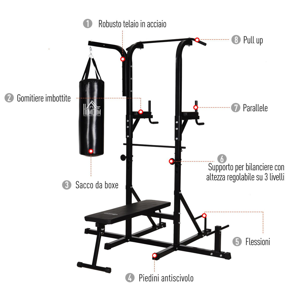 Entraînez et façonnez votre corps avec cette station Hcm multifonctionnelle. Construit en tubes d'acier et équipé de poignées rembourrées et antidérapantes. Conçue pour les athlètes les plus exigeants, la power tower dispose d'une barre de traction, d'une chaise romaine, d'un banc abdominal et d'un sac de boxe inclus pour un entraînement complet de tout le corps. Amenez la salle de sport chez vous !