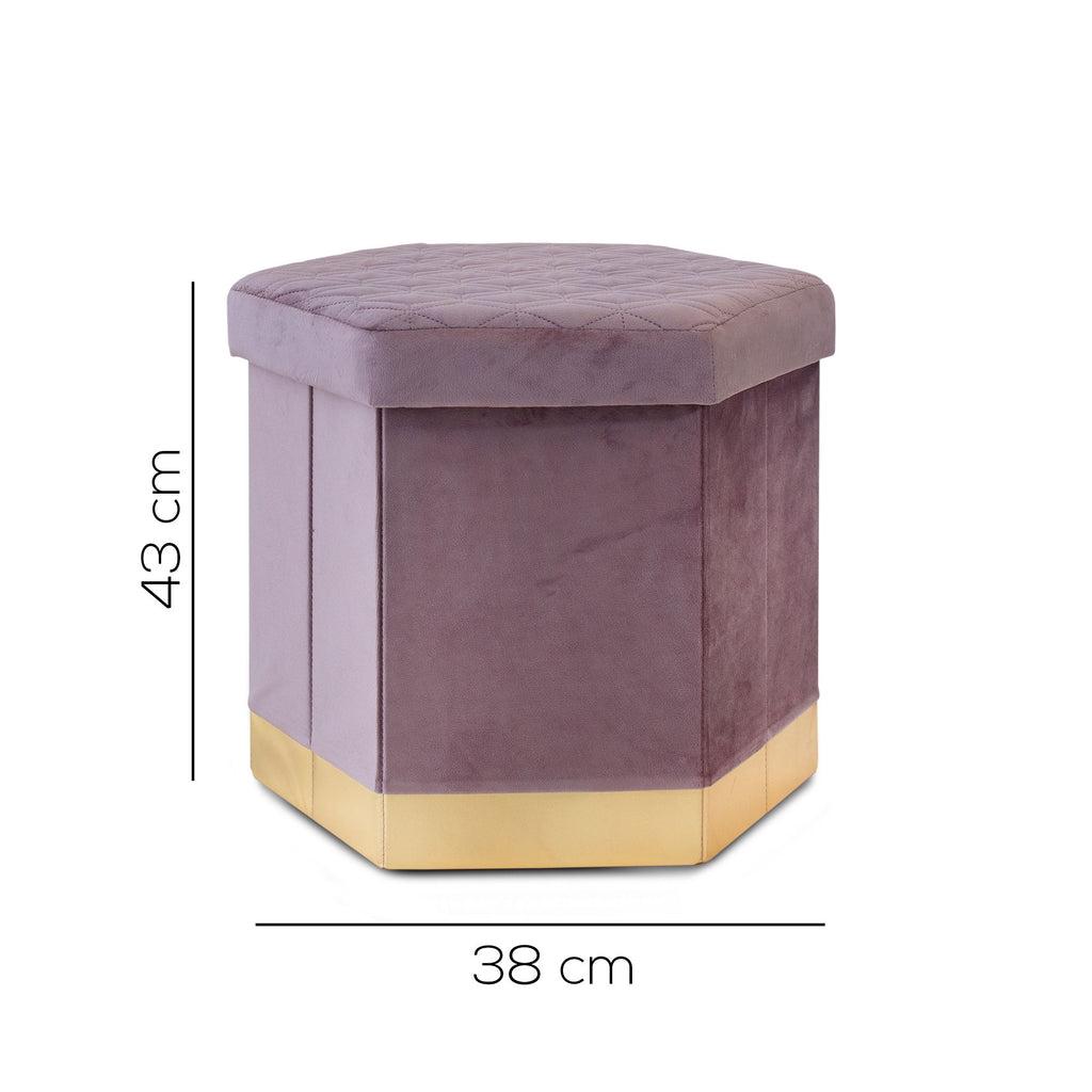 Avec un design à la fois linéaire et particulier, ses lignes forment un hexagone, ce sont les caractéristiques qui rendent le pouf conteneur Victoria unique. Le revêtement en velours poudré est accentué par la base dorée qui le rend encore plus précieux. La partie supérieure du pouf présente une légère couture au motif géométrique.