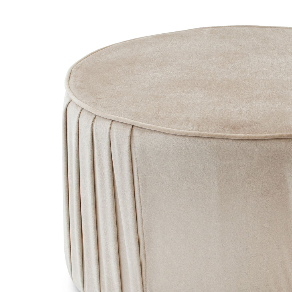 Pouf en velours beige avec rembourrage en polyuréthane, structure interne en bois.