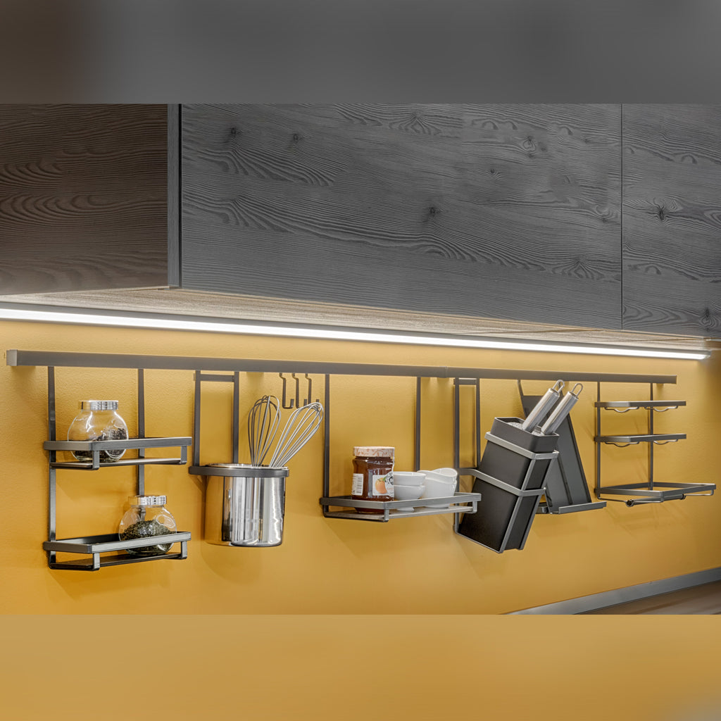 Gamme d'accessoires à accrocher au mur de la cuisine. Vous aurez désormais tous les accessoires à portée de main et plus d'espace sur le plan de travail, pour pouvoir travailler comme dans la cuisine d'un grand restaurant.Son design gris anthracite élégant et sa structure en acier plat sont la dernière tendance en matière de design de cuisine. Ils se caractérisent par leur accrochage sur un profilé aluminium fixé au mur au moyen de supports qui restent cachés en libérant la face du profilé.Divers accessoires sont disponibles avec leurs dimensions optimisées pour tirer le meilleur parti de leur capacité de stockage. La vaste gamme comprend des étagères pour ustensiles, des étagères pour pots à épices et des patères. Vous trouverez également des porte-rouleaux pratiques pour ranger ensemble le papier essuie-tout, le film alimentaire et le papier d'aluminium, un porte-couverts avec seau chromé, un porte-couteau et un porte-tablette qui vous permet de suivre les recettes facilement et en toute sécurité dans la cuisine.
