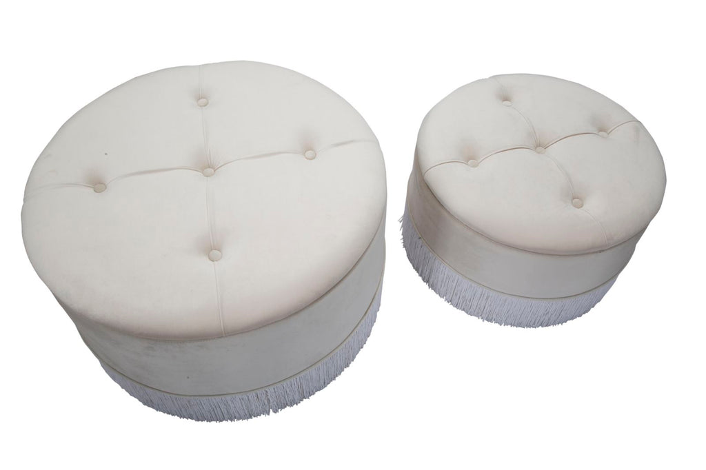Paire de poufs ronds de rangement en bois et velours agrémentés de franges rappelant le style Charleston. Pratique et raffiné, rangez vos pièces avec style