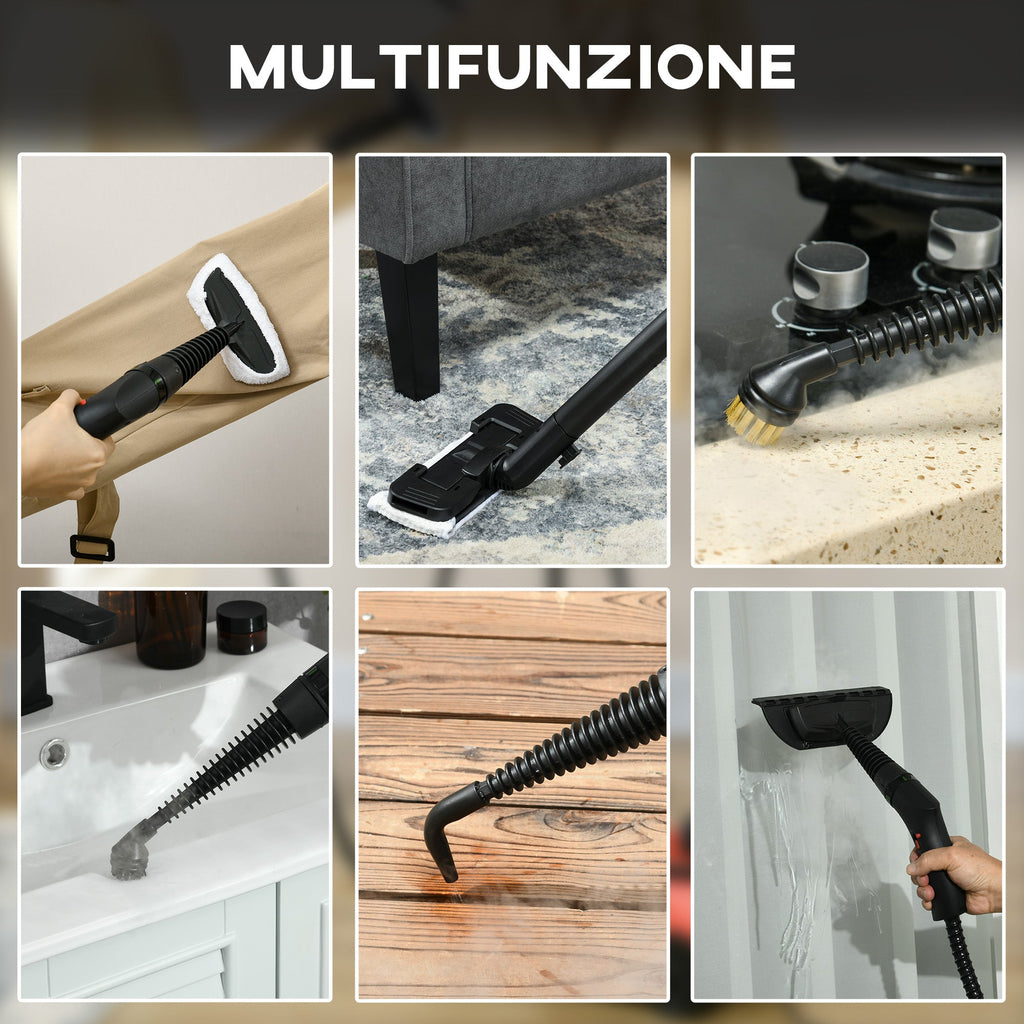 • MULTIFUNZIONE: La pistola a vapore è fornita con una grande varietà di spazzole e accessori, l'ugello grande per il vapore, il panno per l'ugello per i tessuti, la piccola spazzola rotonda, l'ugello angolato, il tubo di prolunga, la spazzola per stirare, la spazzola per i vetri, l'imbuto, il misurino, ecc. per adattarsi alle tue esigenze di pulizia
