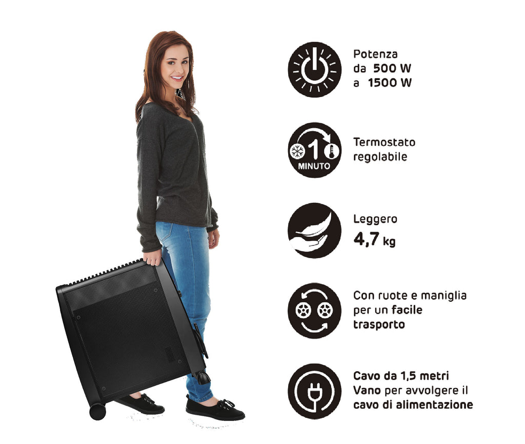 • Potenza Flessibile: Seleziona la potenza ideale tra 500 W, 1000 W e 1500 W per un comfort personalizzato e un consumo energetico ottimizzato.