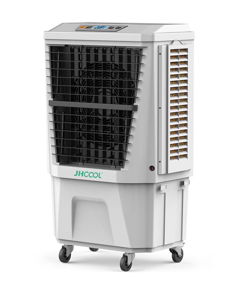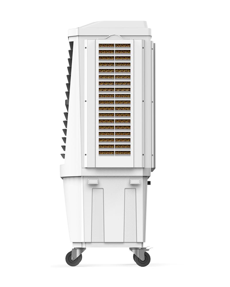 Refroidisseur évaporatif professionnel avec télécommande et ioniseur et filtre pré-poussière. Il réduit la température en exploitant le principe de l'évaporation de l'eau avec ventilation axiale. Le ventilateur dispose de 3 vitesses contrôlées par la télécommande incluse.