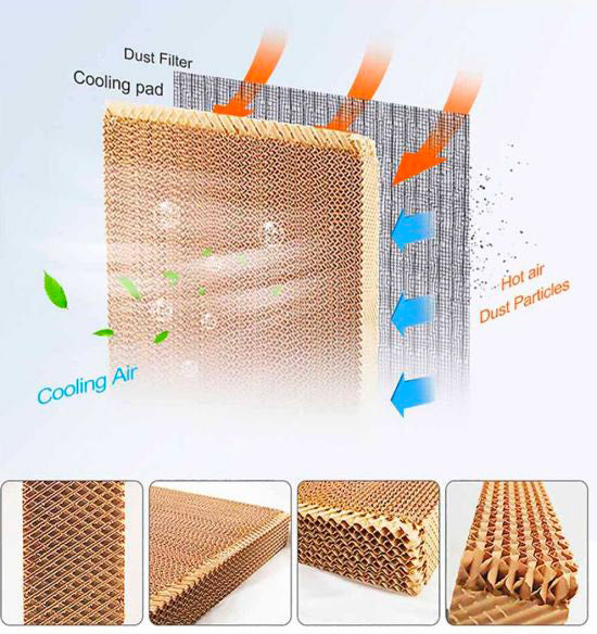 Quando il vento soffia sul corpo sudato si percepisce una piacevole sensazione di fresco, in quanto l’acqua evaporando sottrae calore. Basandosi su questo principio un raffrescatore evaporativo immette molecole d’acqua nell’aria che, evaporando al contatto con l’aria, sottraggono calore riducendo la temperatura ambiente fino a 5-12 gradi. Prima di essere nebulizzata dalla ventola l’acqua contenuta nel serbatoio dell’apparecchio passa attraverso dei pannelli filtranti ed è pertanto pulita.