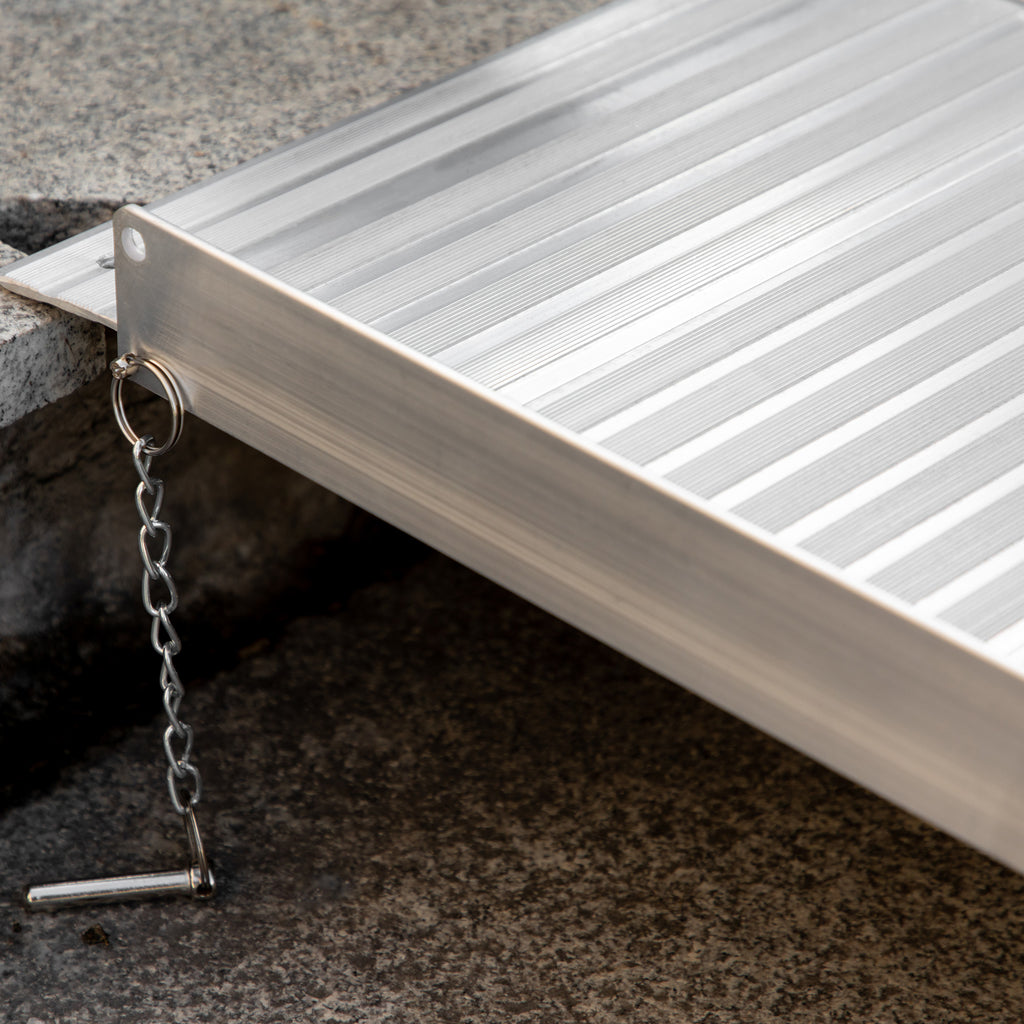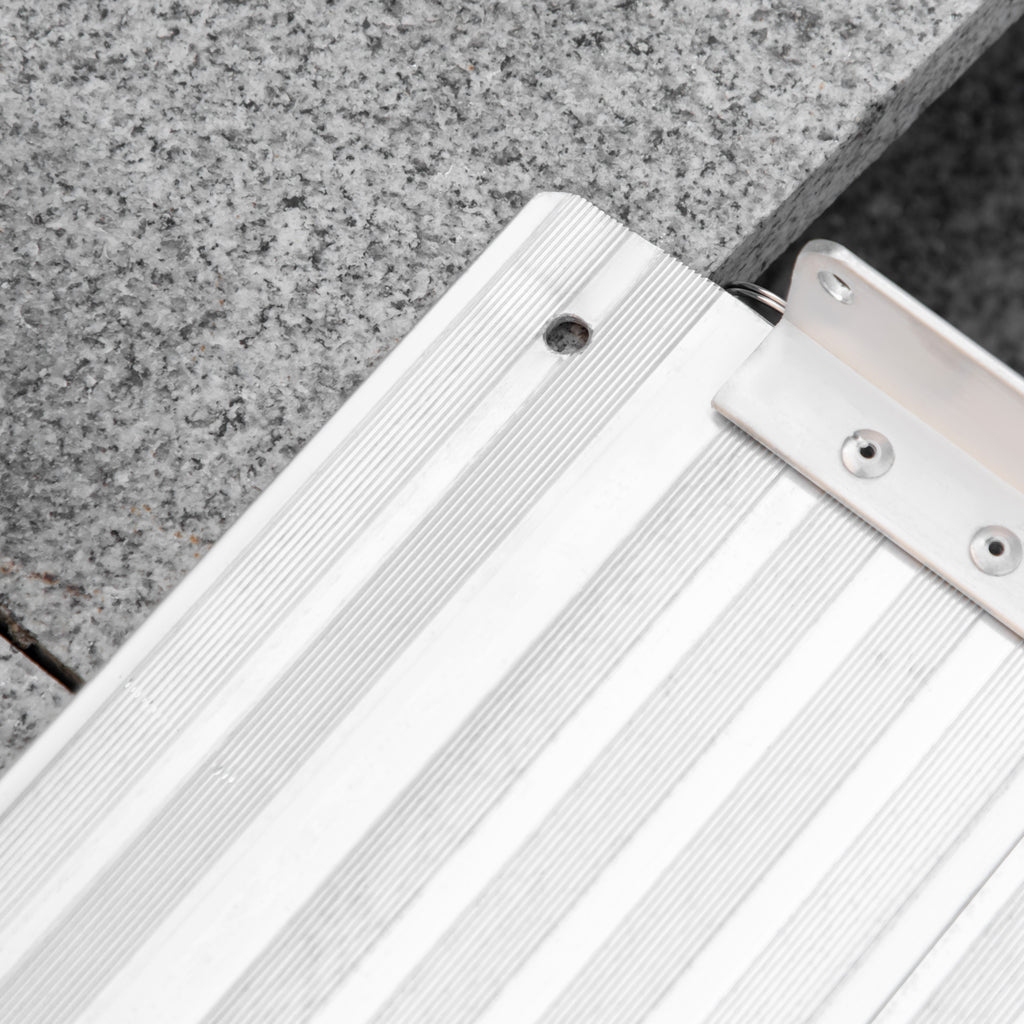 Realizzata in lega di alluminio, sicura e resistente, la rampa per sedia a rotelle ha una superficie antiscivolo con bordi rialzati di sicurezza. Ha un design pieghevole ed è facile da trasportare grazie alla pratica maniglia. Estremamente robusta, sostiene fino a 272kg e permette di superare dislivelli ridotti.
