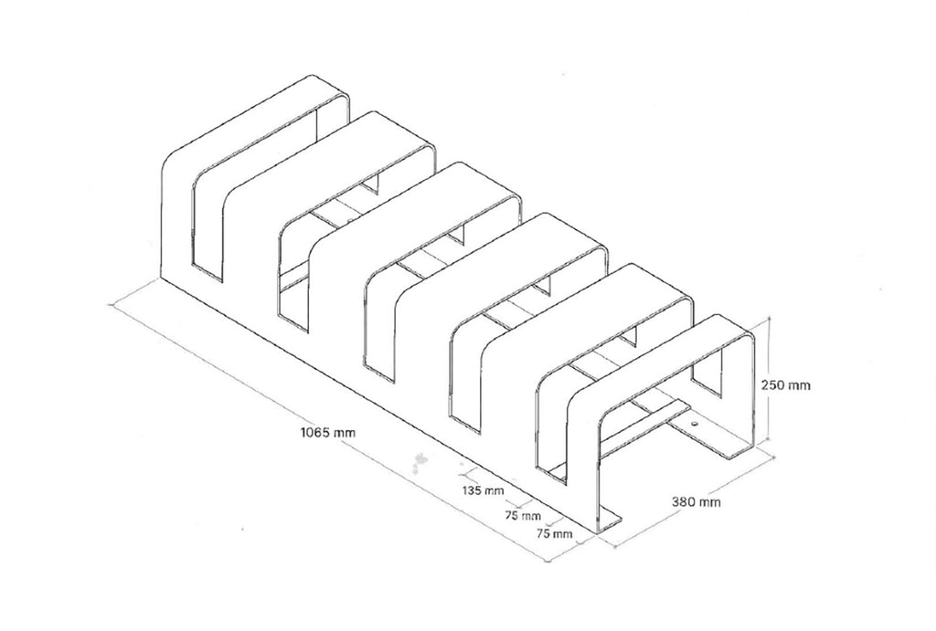 Questa rastrelliera portabiciclette, per arredo urbano bifacciale, a 5 posti, vi consente di parcheggiare con poco ingombro le vostre biciclette e mantenerle in ordine e al sicuro. Realilzzato in metallo trattato e verniciato.