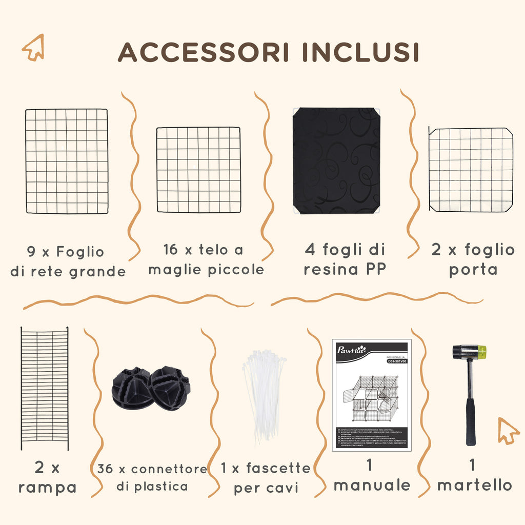 Grazie a questo recinto per animali, i piccoli animali godranno di un ambiente spazioso e protetto. La struttura è dotata di 27 pannelli a rete, 4 in resina PP e 36 lacci angolari per adattarsi a varie forme e misure e inserirsi in ogni spazio. La struttura in metallo è solida e le fascette garantiscono ulteriore stabilità per la sicurezza degli animali. Il recinto si rivela perfetto per gatti, conigli, cincillà, dando tutto lo spazio necessario per giocare, riposare e nutrirsi. Recinto per animali adatto a gatti, conigli, cincillà. La gabbia per animali permette di interagire con i tuoi animali da tutti i lati. Recinto per animali in acciaio resistente e pannelli in resina PP. I 27 pannelli a rete con i 4 pannelli in resina PP e i 36 lacci ti permettono di modellare la gabbia per animali come desideri. 2 porte e 2 rampe incluse. La confezione include fascette e piedini antiscivolo per una maggiore sicurezza. Facile da montare.