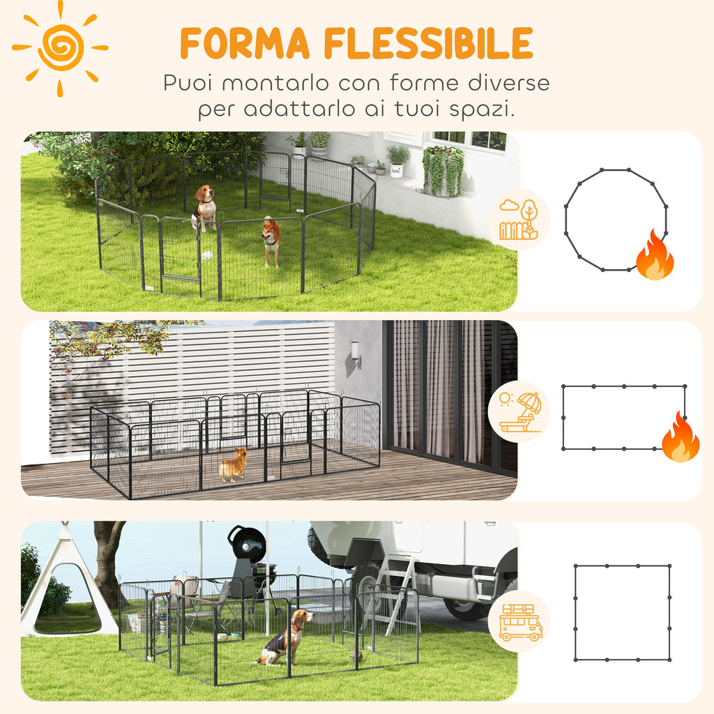 Scopri il robusto recinto per cani, un rifugio versatile a 12 pannelli per il tuo amico a 4 zampe! Grazie alla sua struttura modulabile, il recinto può assumere forme diverse, come un rettangolo o una L, per adattarsi perfettamente al tuo spazio e alle necessità del tuo pet. Il recinto offre un ambiente sicuro e ampio e un ingresso comodo, ideale sia per interni che per esterni. Si piega inoltre con estrema facilità per poter essere riposto senza problemi.