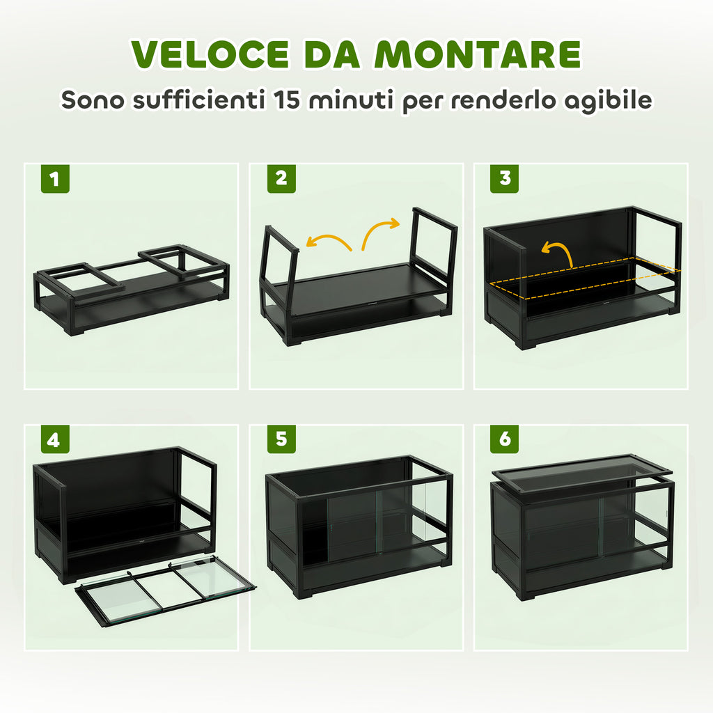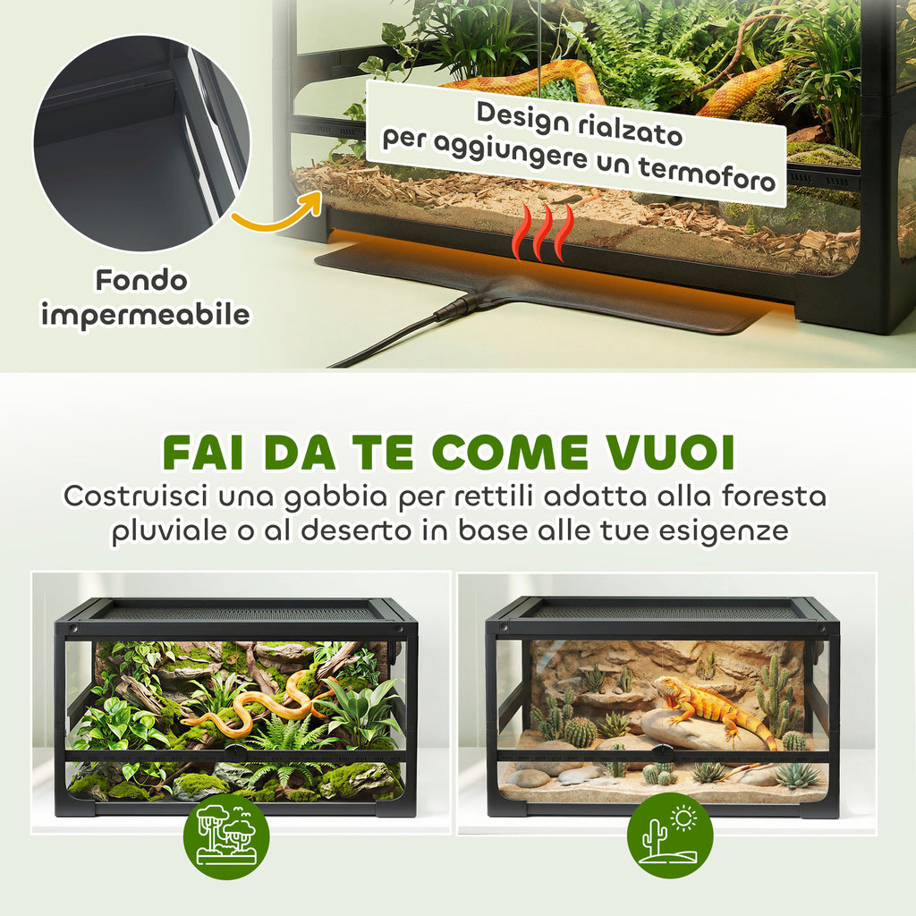 - PRATICO E SICURO: Il nostro rettilario è dotato di un coperchio bloccabile e porte scorrevoli che prevengono fughe impreviste dei tuoi animali. La capacità di 86.3L del vivario offre molto spazio per ospitare lucertole, ragni, gechi, serpenti o insetti, e si monta facilmente in appena 15 minuti con design pieghevole