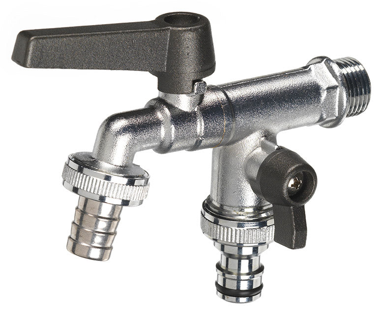 Robinet à boisseau sphérique chromé double sortie, sortie principale avec raccord traditionnel en caoutchouc, sortie secondaire avec raccord rapide. Leviers peints.