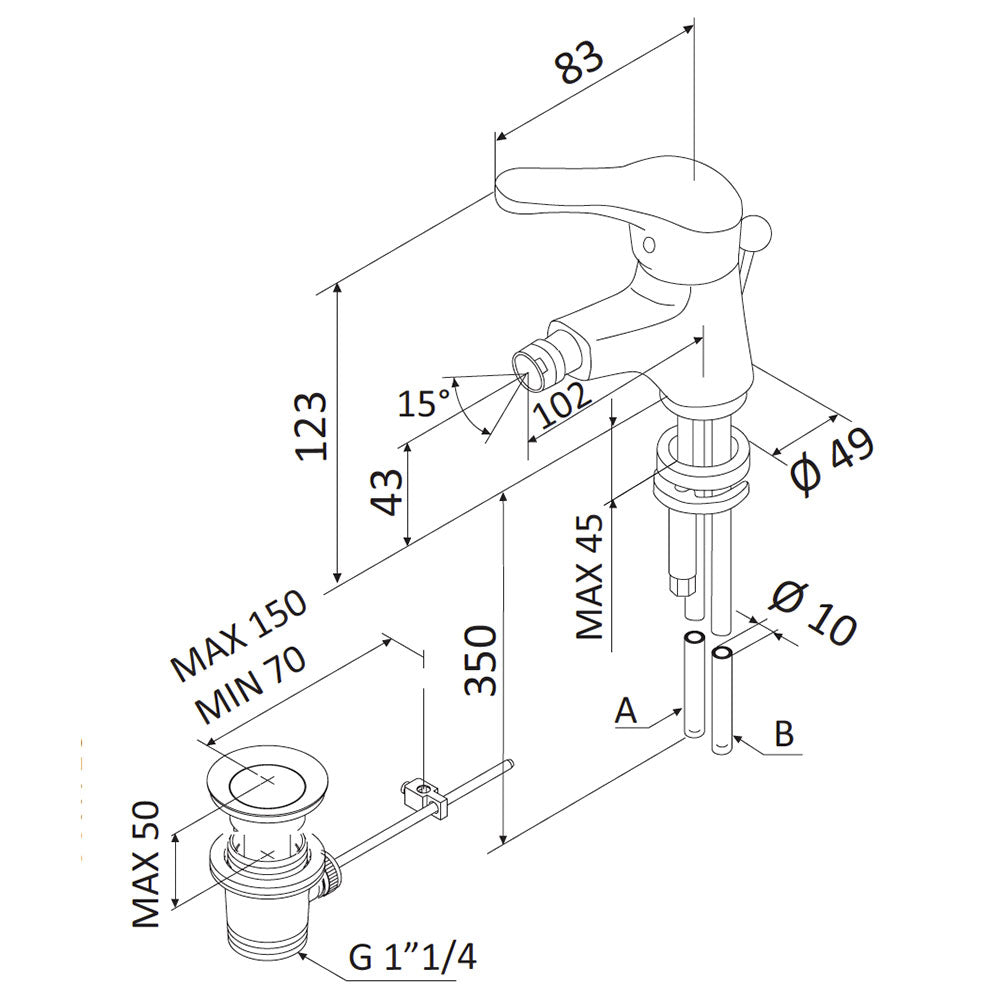 Mariani Epic 493/E2 Mitigeur bidet monocommande avec vidage . Réglage de la cartouche à disque céramique ø 40 mm.