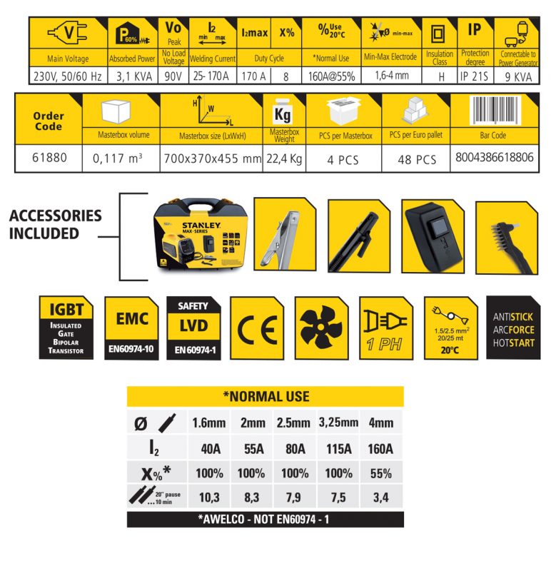 La soudeuse Stanley Max 180 adaptée au soudage à l'électrode , communément appelée MMA , utilise un générateur de courant inverseur qui reproduit un courant basse tension et de nombreux ampères qui sont utilisés pour former un arc de tension , ce qui grâce à sa chaleur fait fondre le métal des pièces à souder. soudé et le matériau d'apport constitué d'une électrode enrobée . Pour réaliser un soudage parfait , il faut régler le bon ampérage, qui varie en fonction du diamètre de l'électrode et de l'épaisseur à souder. Léger , compact et fiable . Convient aux électrodes rutiles, basiques, en acier inoxydable et en fonte. Avec mallette .