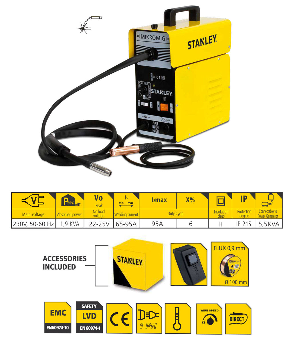 Le poste à souder Stanley Mikromig adapté au soudage à fil continu sans gaz , communément appelé MOG , utilise un générateur de courant alternatif qui reproduit un courant basse tension et de nombreux ampères qui sont utilisés pour former un arc voltaïque , celui-ci par sa chaleur fait fondre le métal des pièces à souder et le matériau d'apport consistant en un fil continu . Le soudage MOG sans gaz est utilisé lorsqu'une productivité élevée et une flexibilité d'utilisation suffisante sont requises. Equipé de fil fourré .