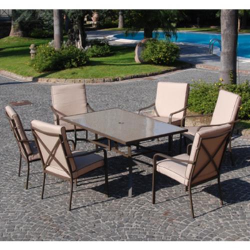 Coin salon composé d'une table avec plateau en verre décoré couleur marbre, 6 fauteuils empilables avec coussin en polyester beige, structure tubulaire peinte avec poudre époxy résistante aux agents atmosphériques et à la rouille.
