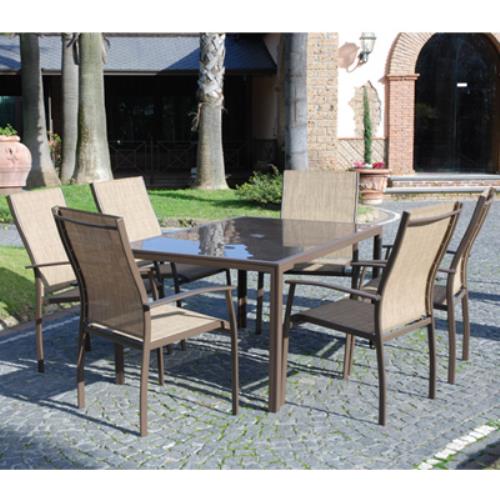 Salon complet avec 6 chaises, fauteuils et table en verre pour salon de jardin extérieur
