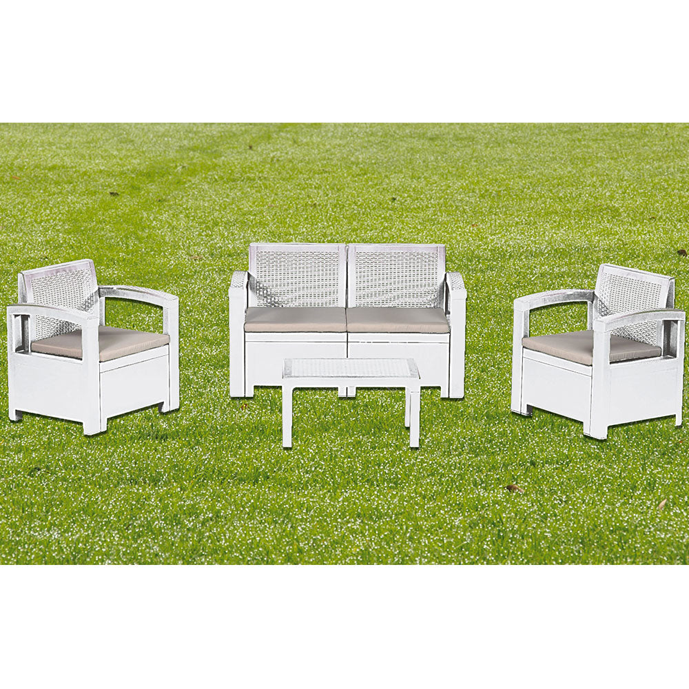 Salon en résine antichoc composé d'un canapé 2 places, deux fauteuils, table basse et coussins.
