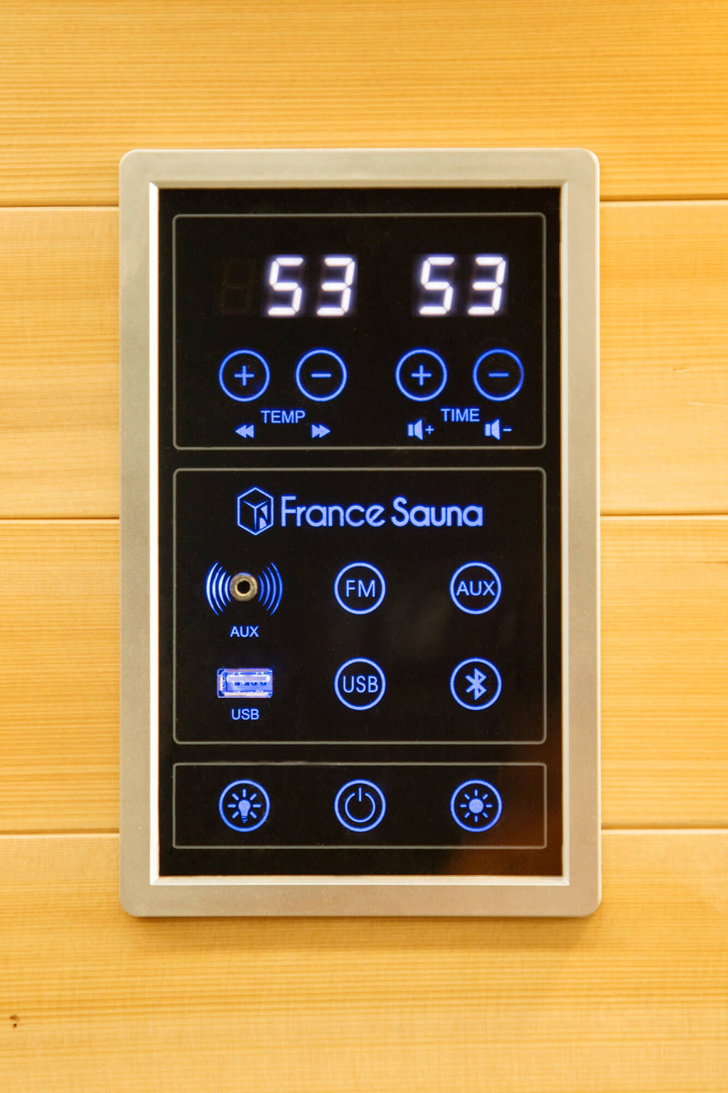 Chacun des émetteurs Quartz du sauna Apollon dispose d'un bouton ON/OFF. Profitez d'une cabine pour personnaliser votre moment de bien-être en allumant uniquement les panneaux nécessaires à votre détente. Un panneau de carbone au sol fournit une chaleur unifiée dans tout le sauna.