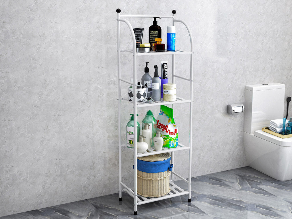 Étagère à 4 niveaux avec structure et étagères en acier blanc. Idéal pour la cuisine ou la salle de bain, il peut être utilisé dans toutes les pièces de la maison, avec style et fonctionnalité.