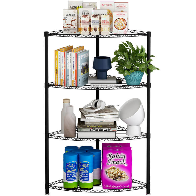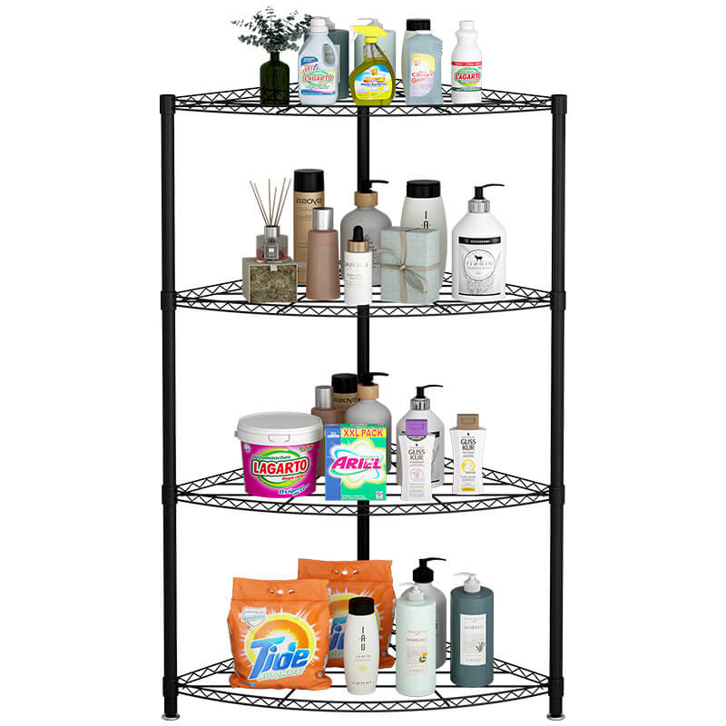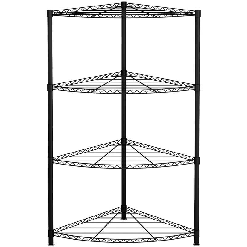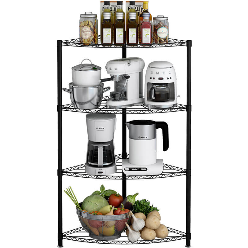 Étagère à 4 niveaux avec structure et étagères en fil métallique noir. Idéal pour la cuisine ou la salle de bain, il peut être utilisé dans toutes les pièces de la maison, pour résoudre l'ameublement des coins avec style et praticité.